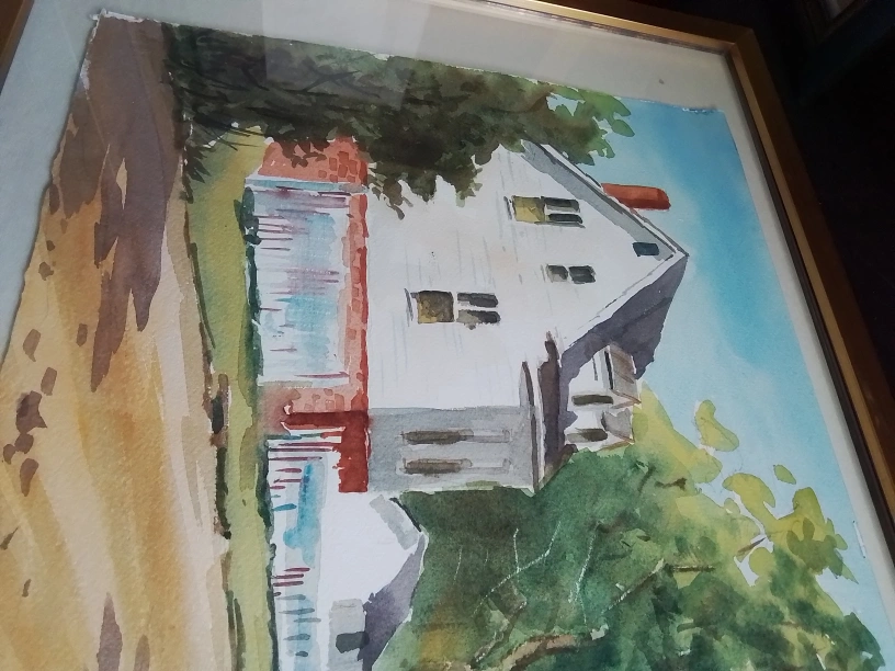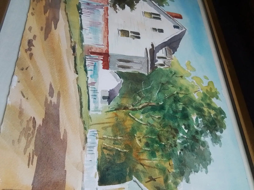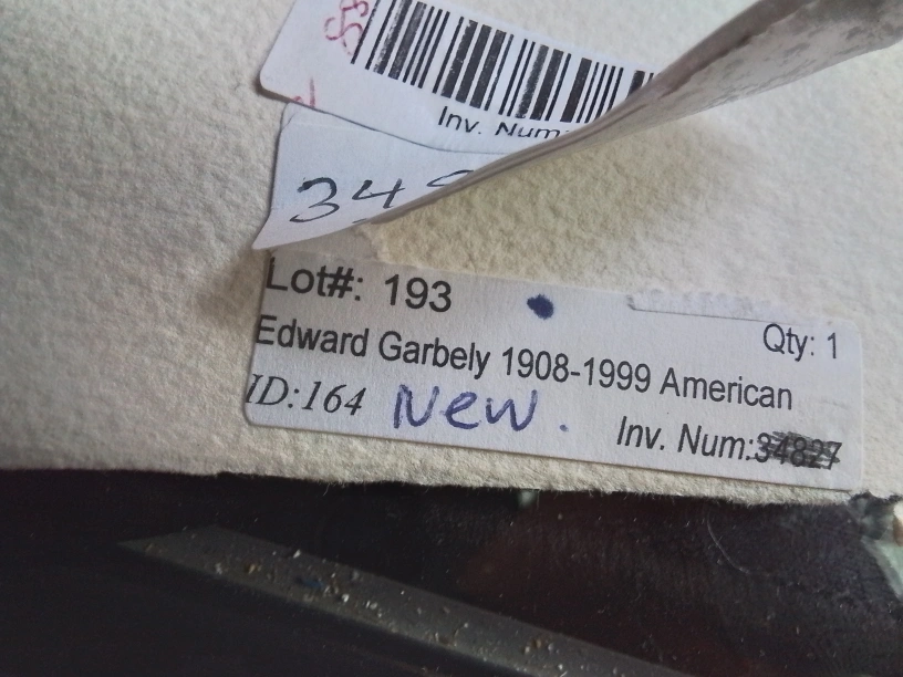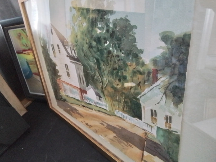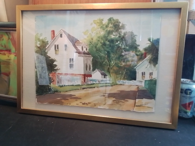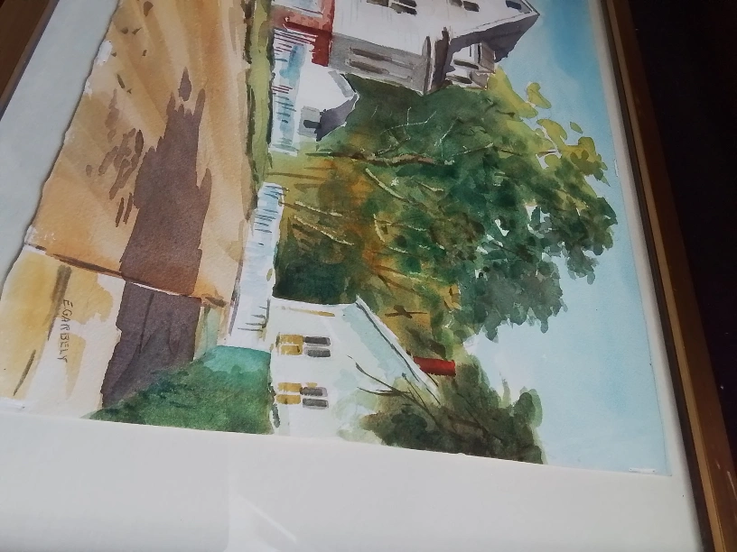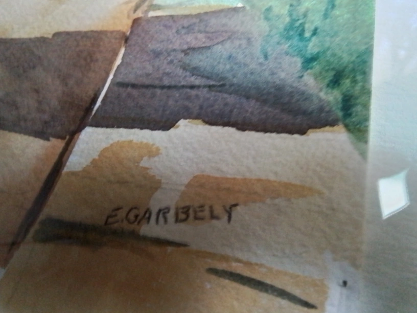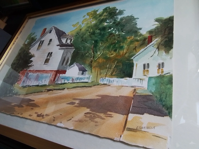 American Watercolor on Paper Signed Edward Garbely Original watercolor painting. Depicts two houses on a tree-lined street. Gold-coloured frame. Artist signature visible. Excellent condition. Watercolor on paper. Featuring suburban street scene. Signed "E GARBELY" to the bottom right corner. Attributed to Edward Garbely (1908 - 1999). 11.25 x 15 inch (28.6 x 38.1 cm), Frame 19.75 x 13.75 Estimate 150.00 - 300.00 USD Pickup at Young Street and Steels Ave