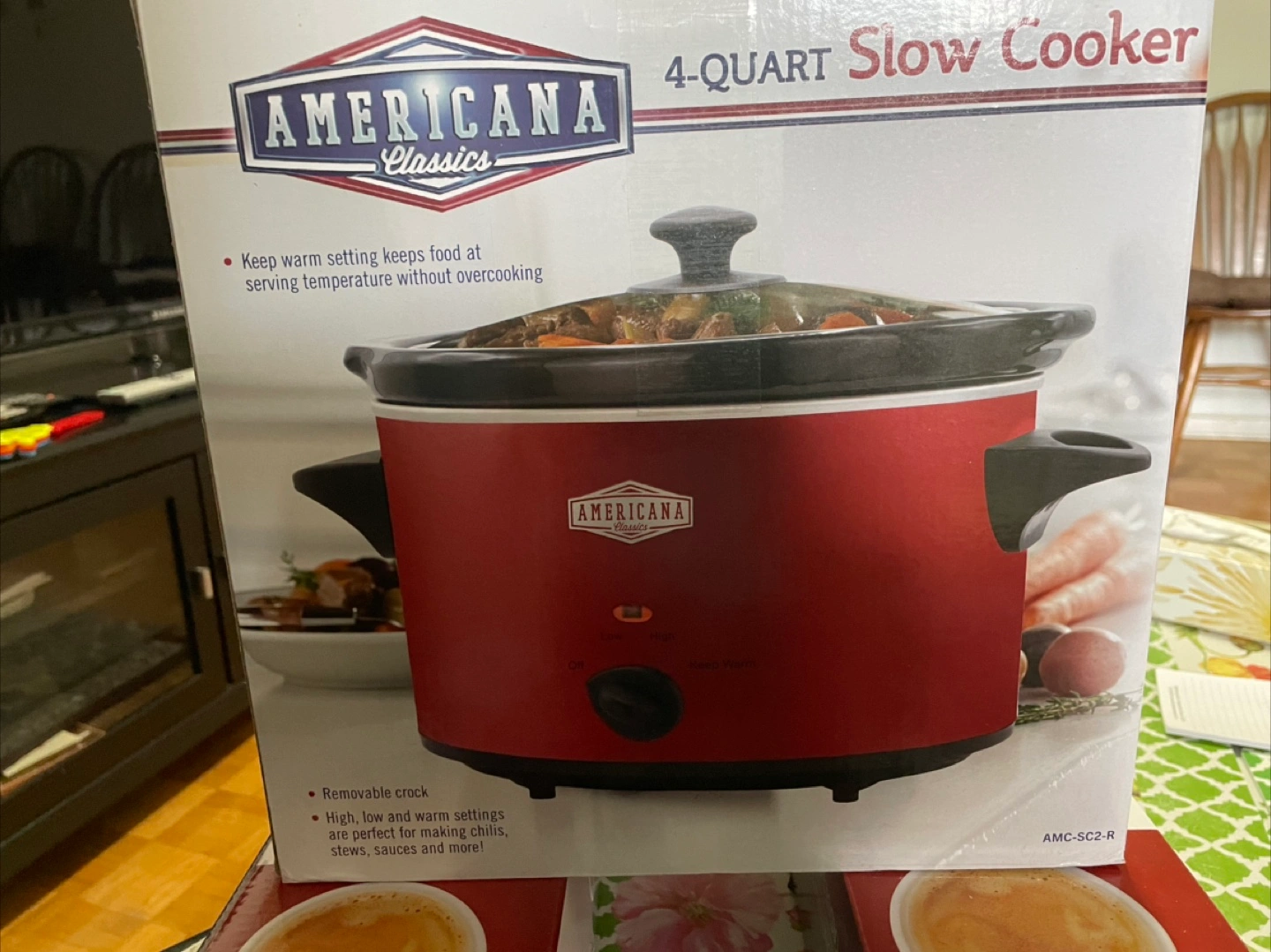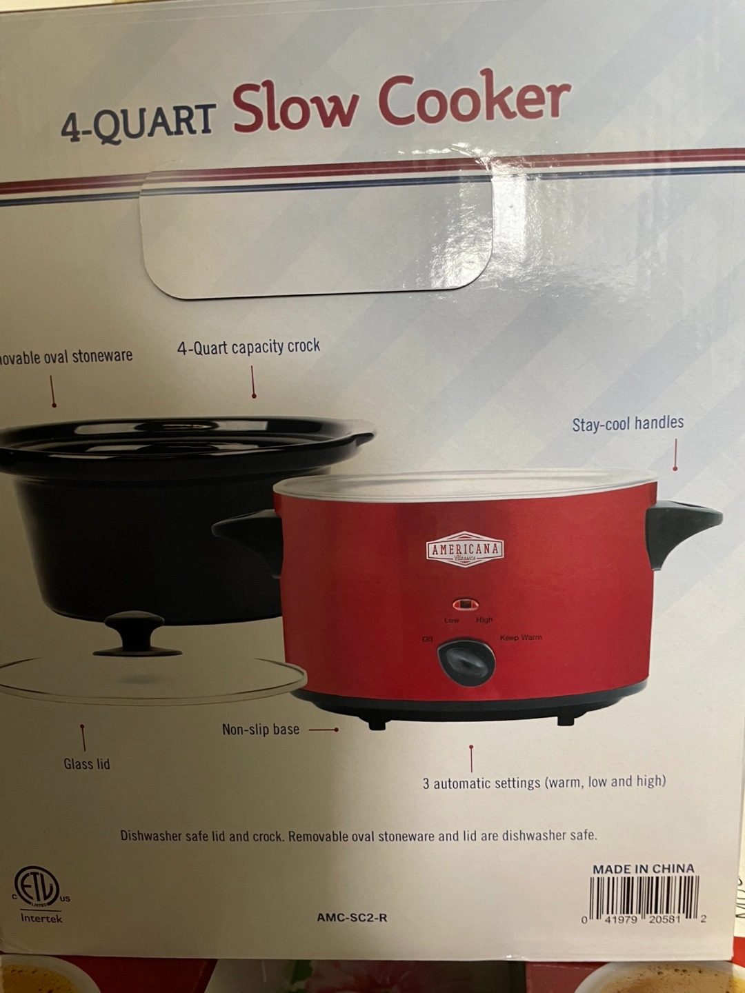 5Red 4-quart slow cooker. Removable oval stoneware and lid. Dishwasher safe. Non-slip base. Stay-cool handles. Three automatic settings: warm, low and high. Keep warm setting keeps food at serving temperature without overcooking.