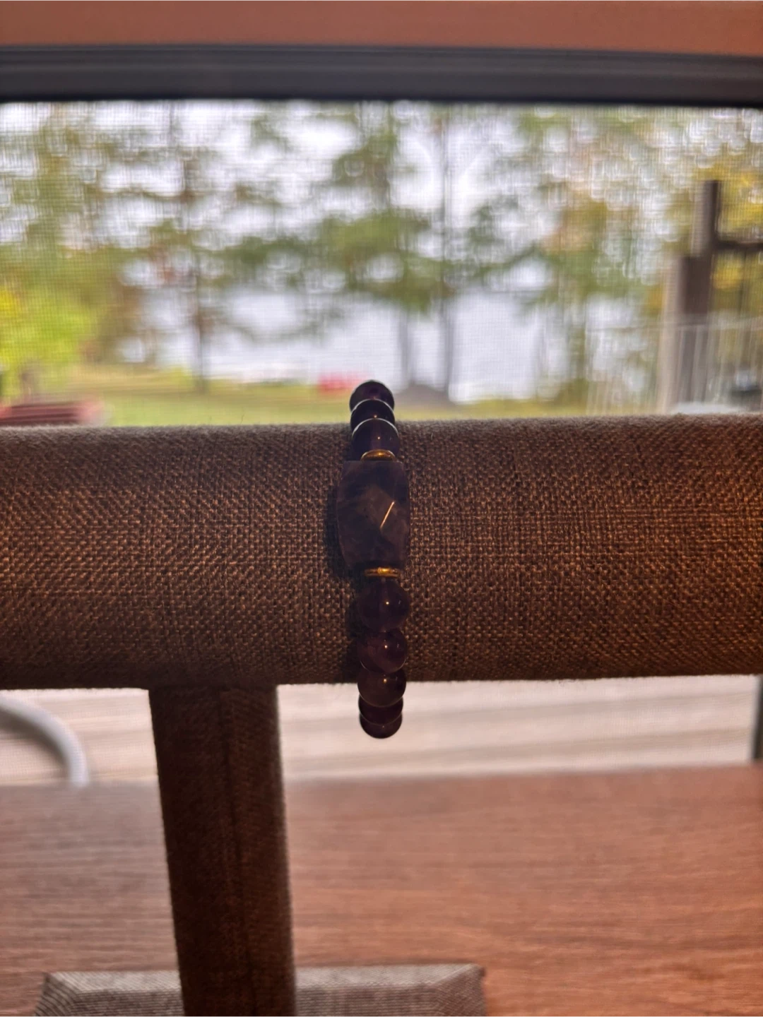 Selling a beautiful amethyst beaded bracelet. It features a mix of round amethyst beads and a rectangular focal bead, all strung together with a gold-tone accent. A lovely piece to add to your collection!