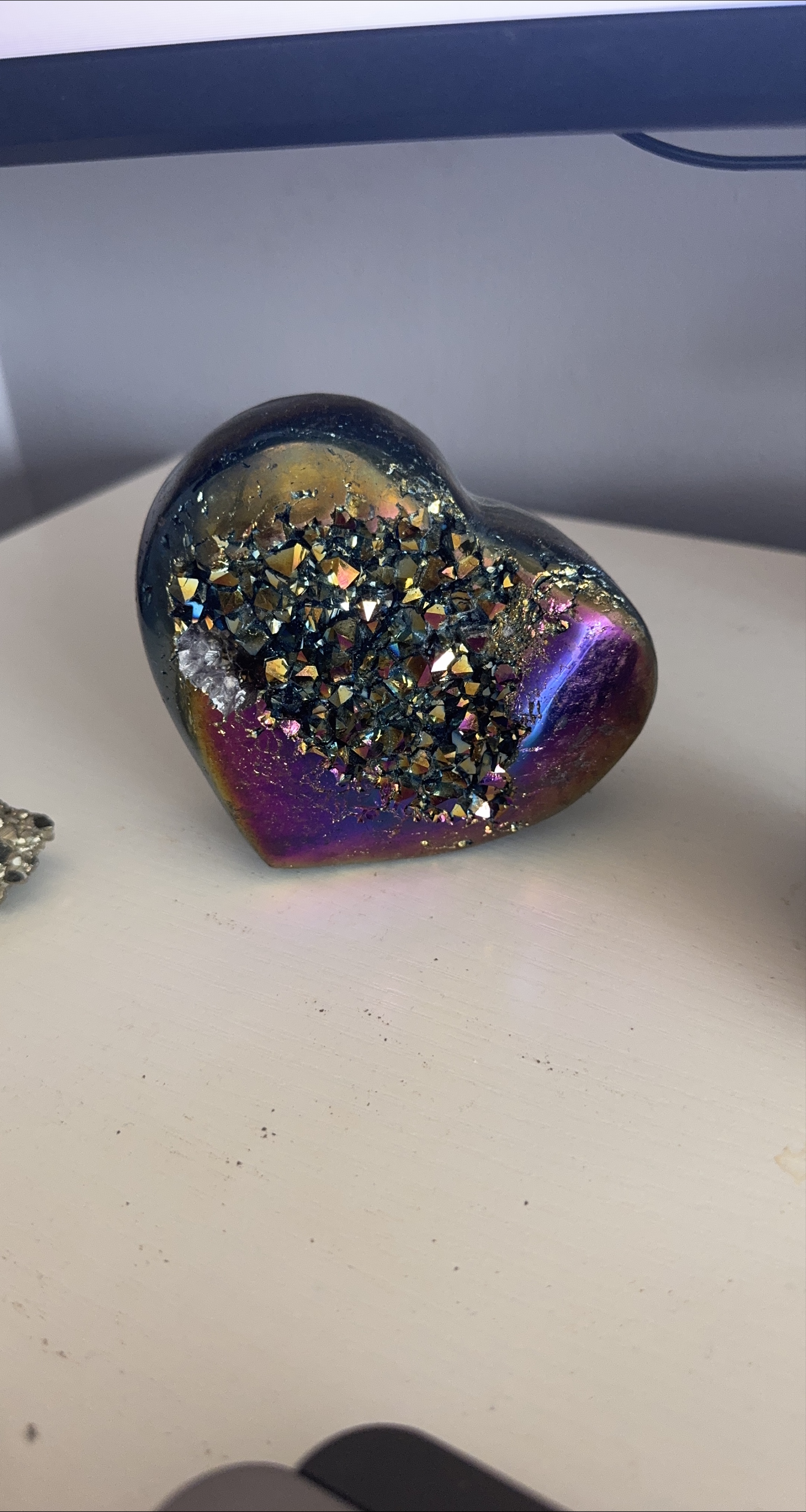 Selling this beautiful amethyst druzy heart. It has a lovely iridescent finish and would make a great addition to any crystal collection!