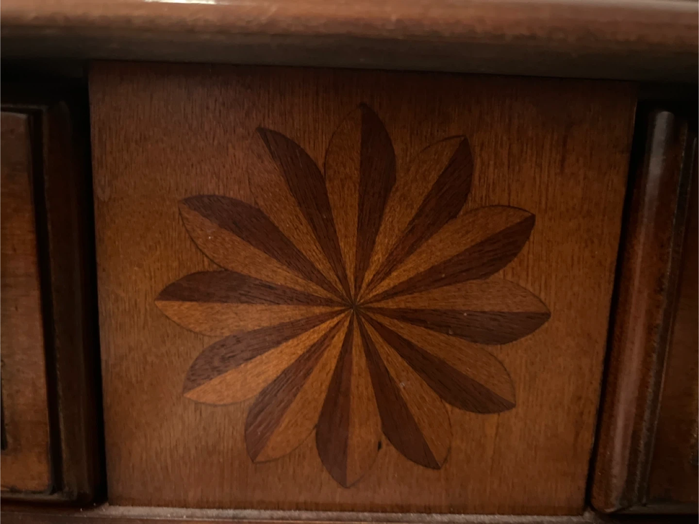 The inlay work on the top creates a beautiful focal point and gives the table a refined vintage character.