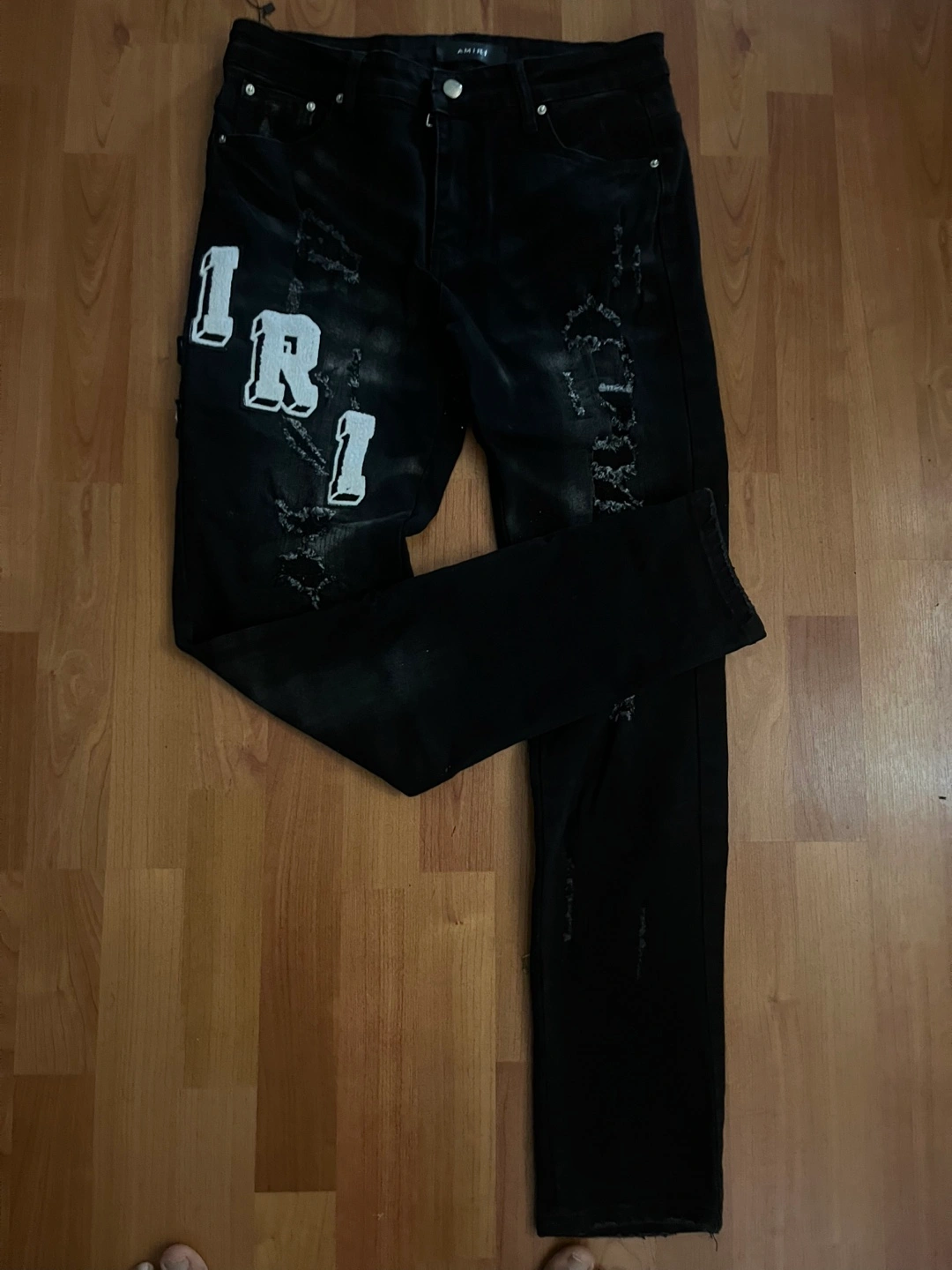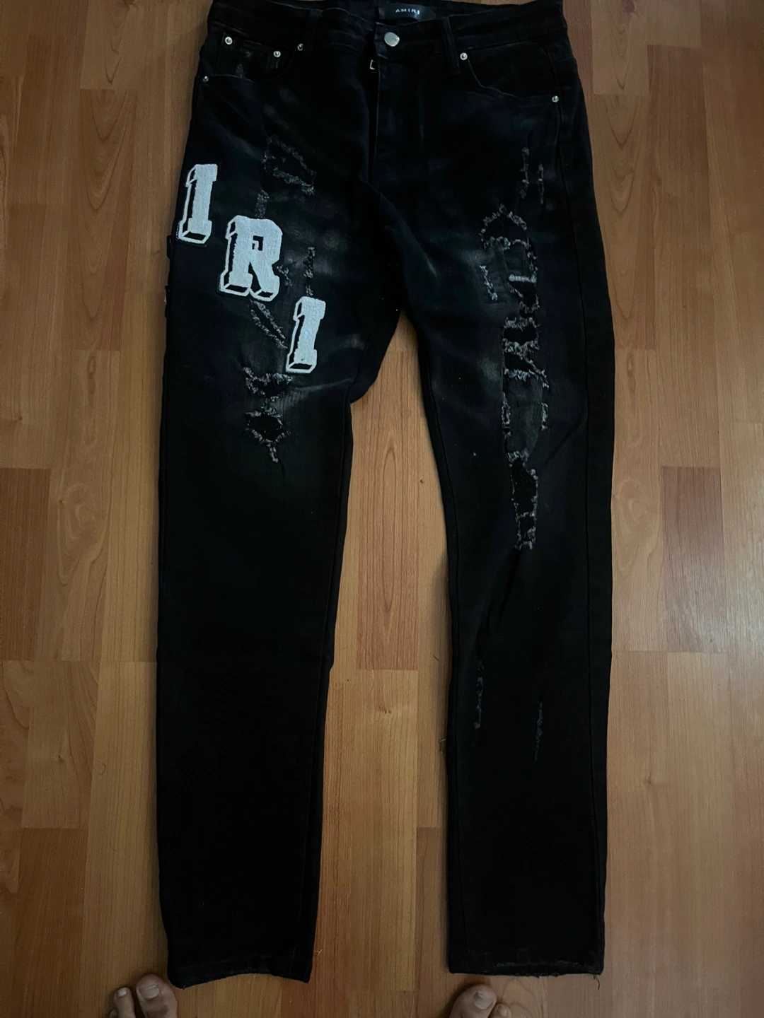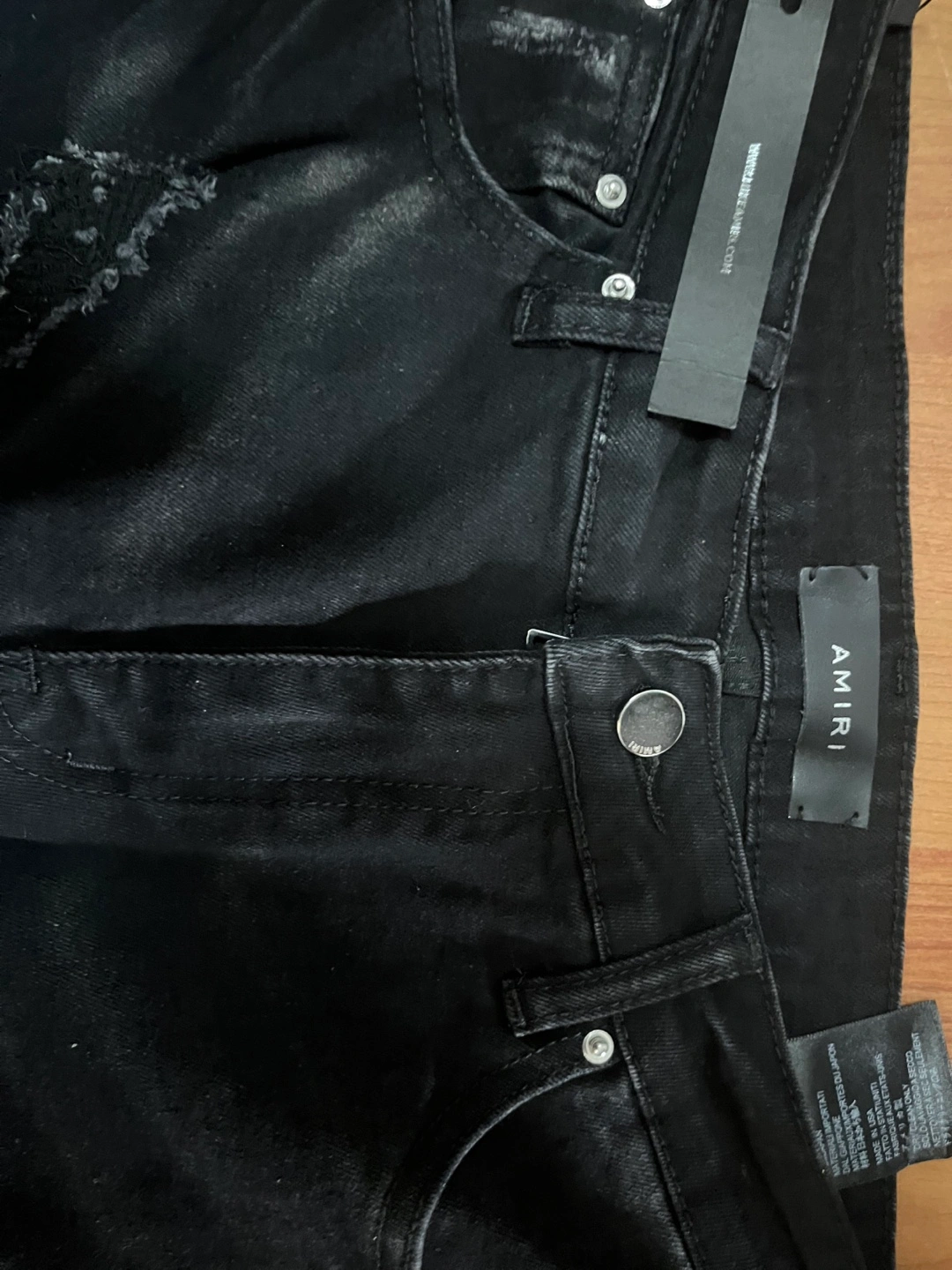 Selling a pair of Amiri black distressed jeans. They have some cool detailing and would look great in your wardrobe!