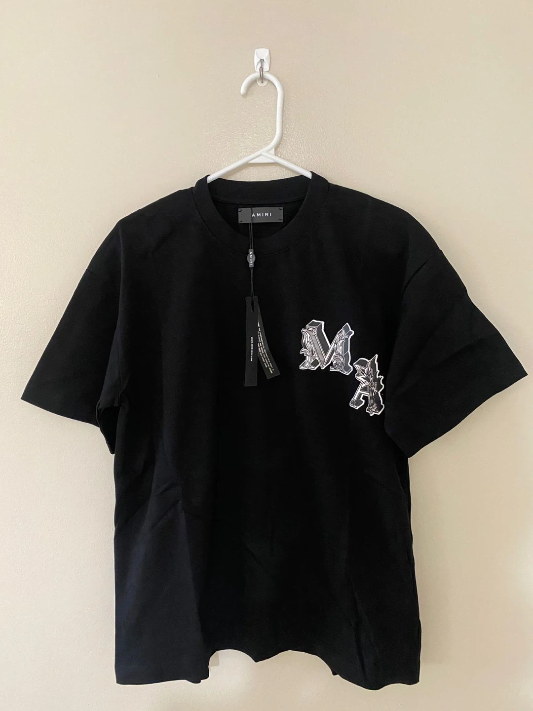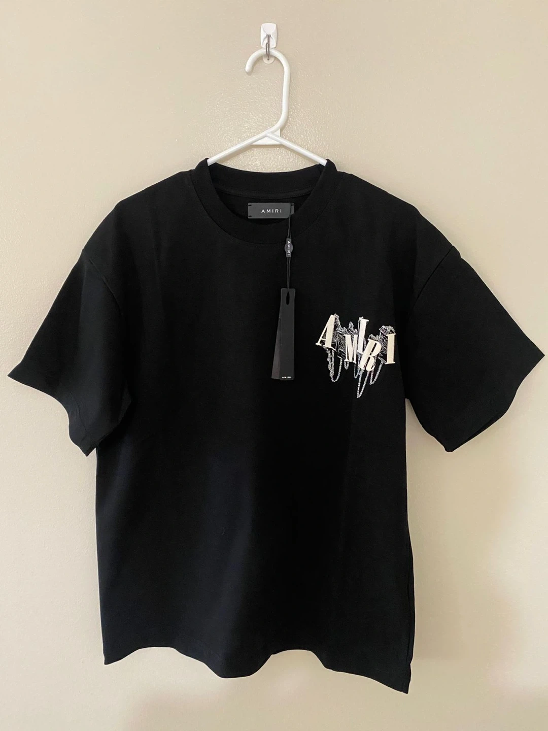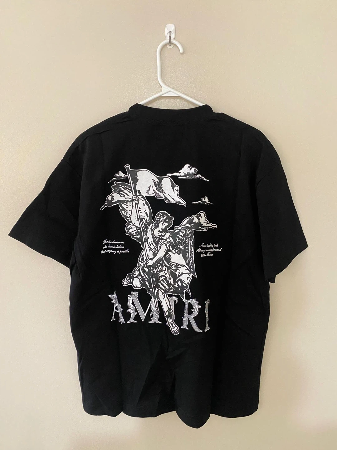 10Selling a black AMIRI t-shirt with various graphic designs on the front and back. The shirt is in great condition and ready for a new home!
