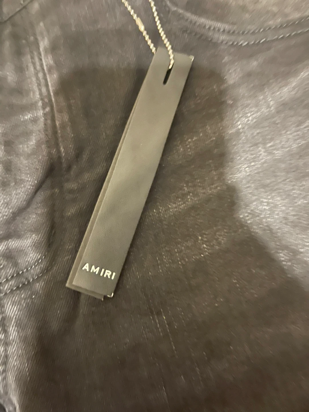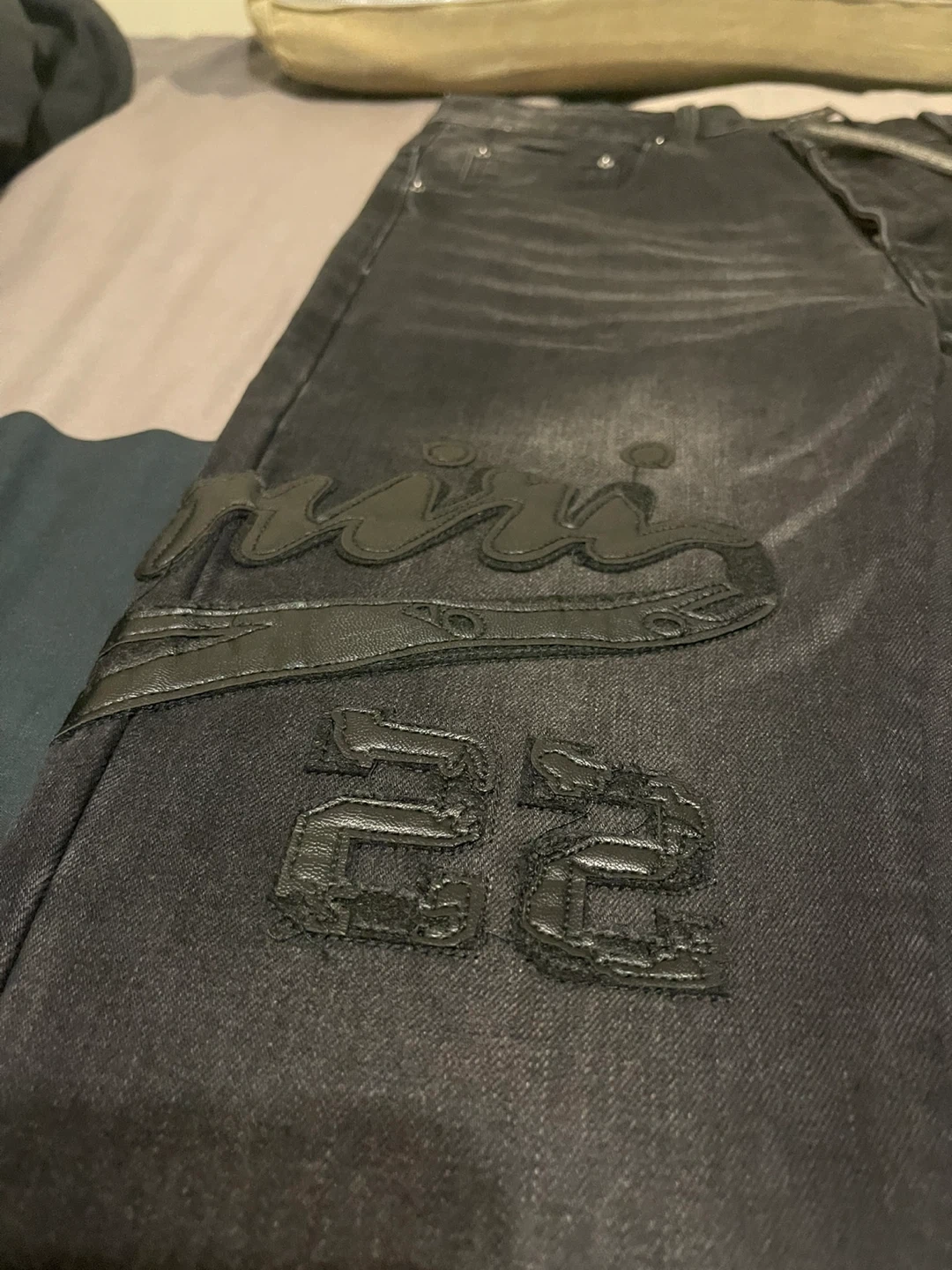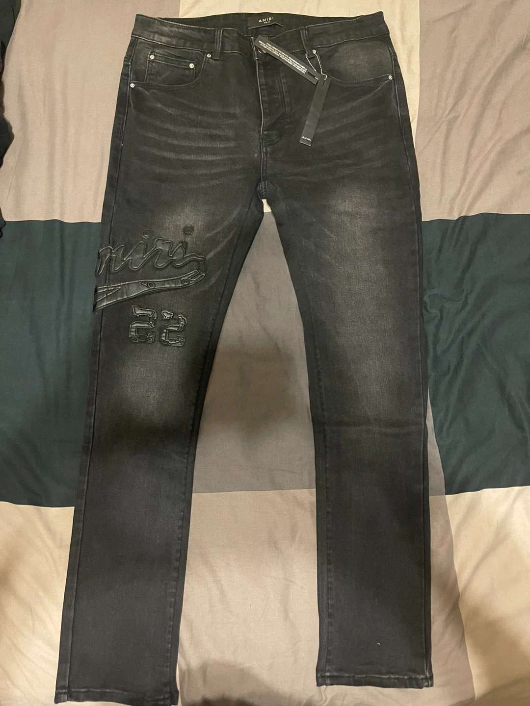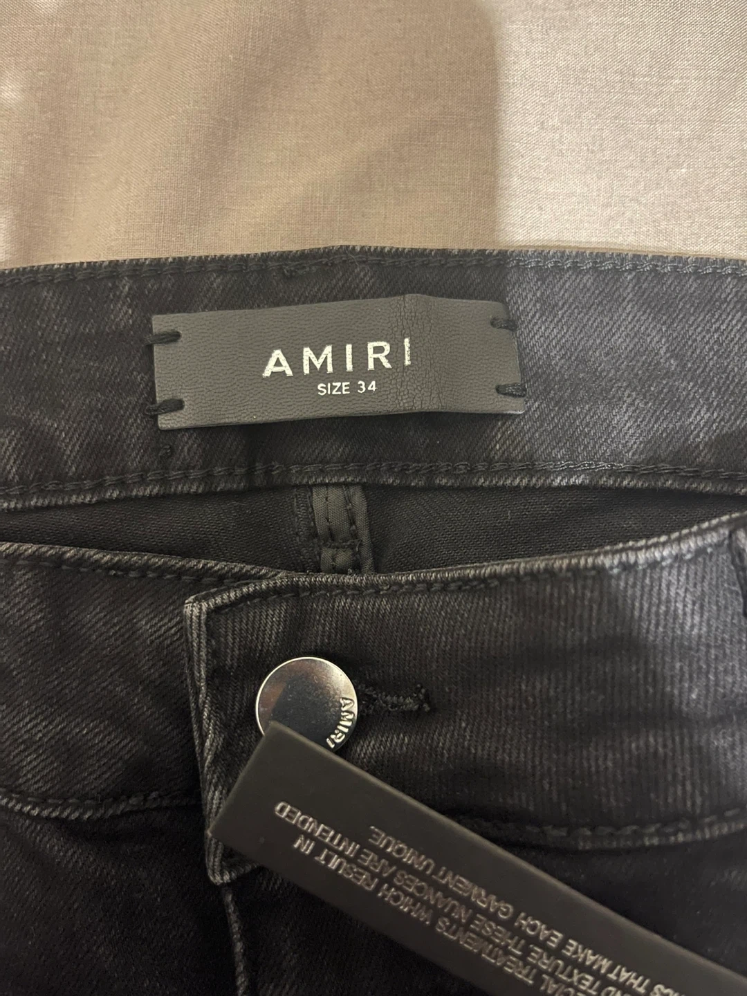Selling a pair of AMIRI jeans in black. They are a size 34 and have a cool design on the leg!