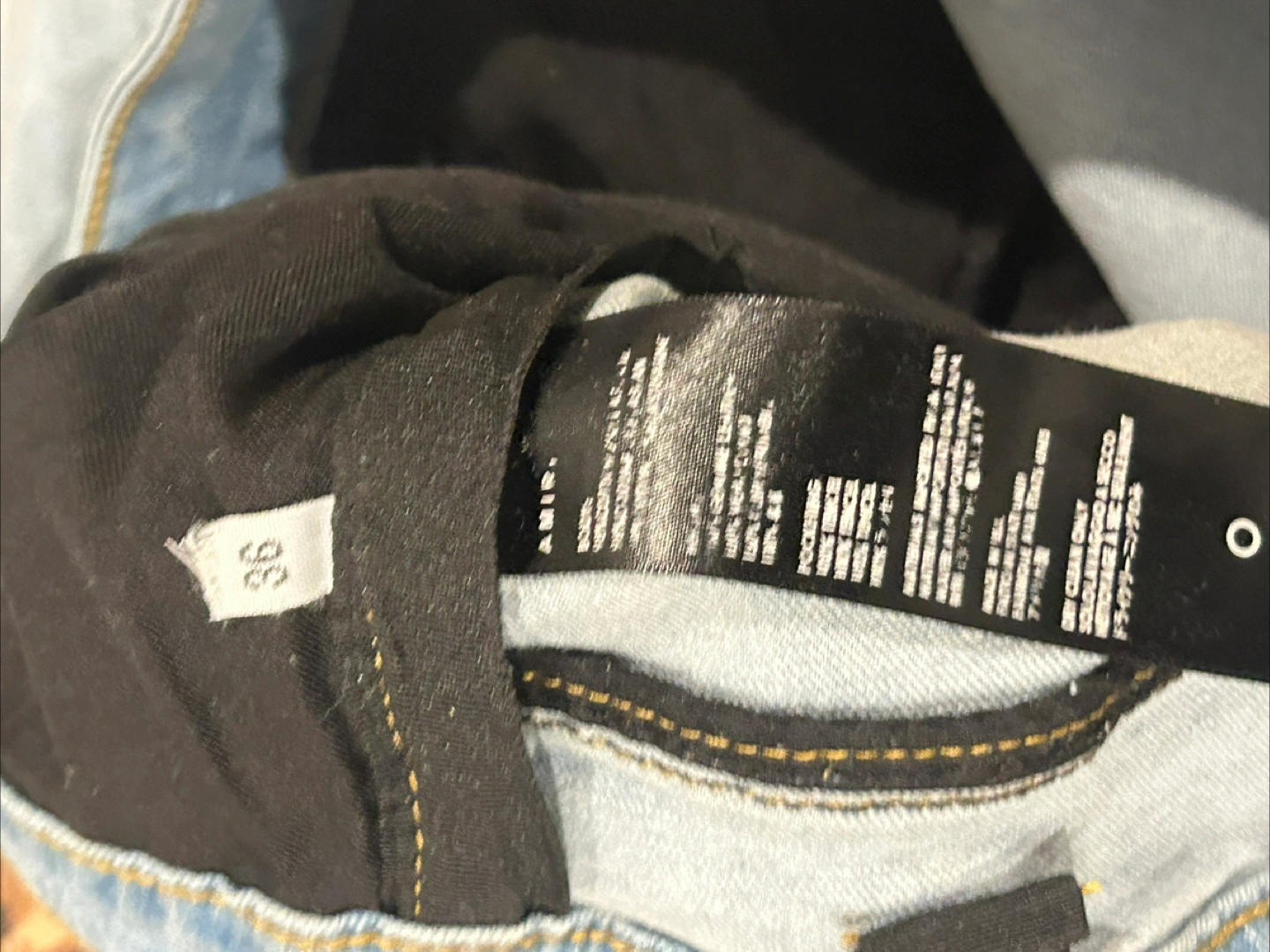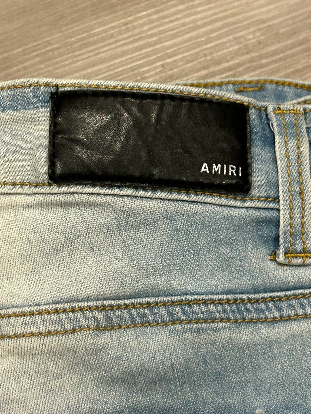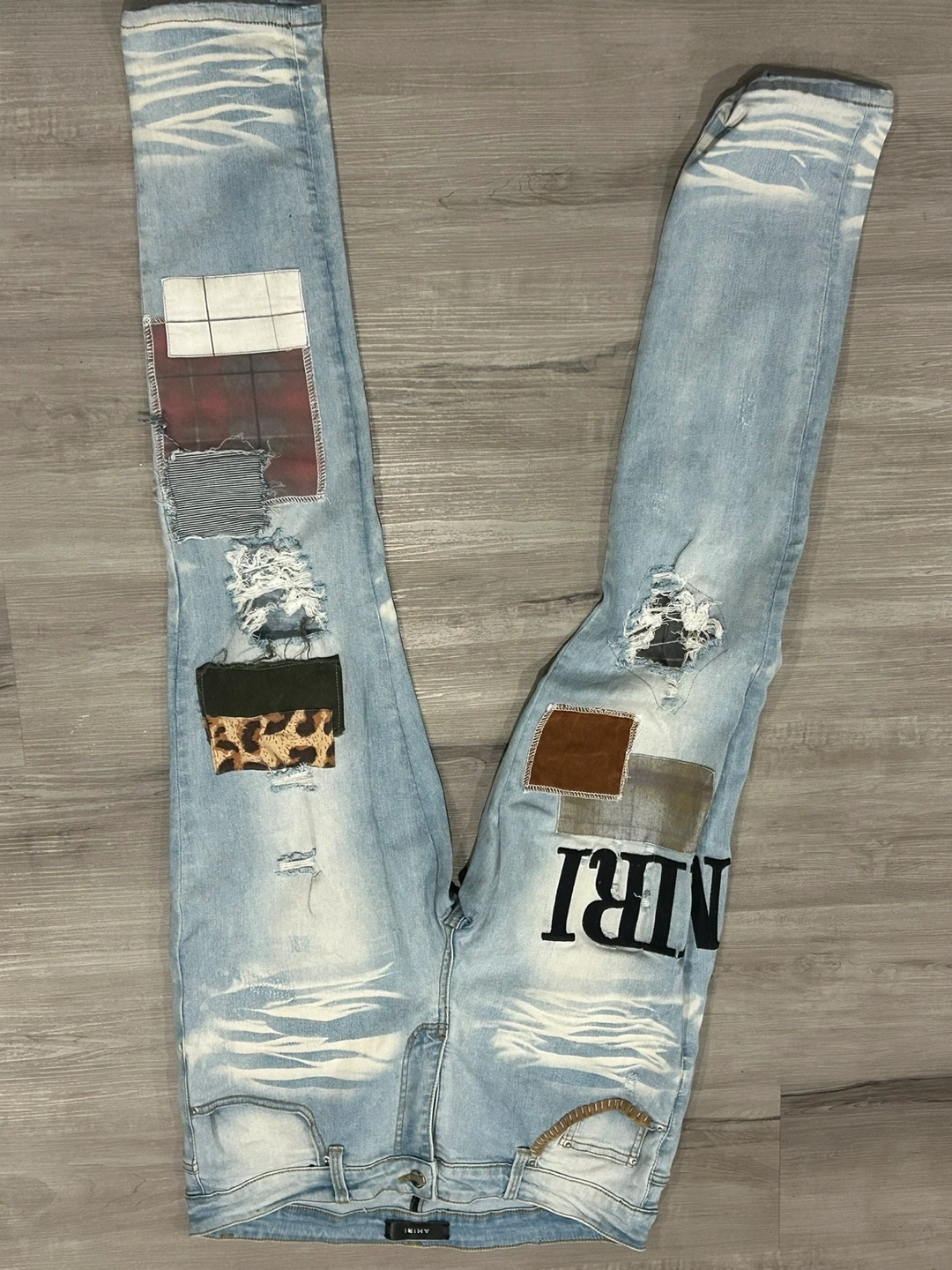 Selling a pair of AMIRI distressed denim jeans. They feature unique patchwork and the AMIRI logo. These jeans are sure to make a statement!