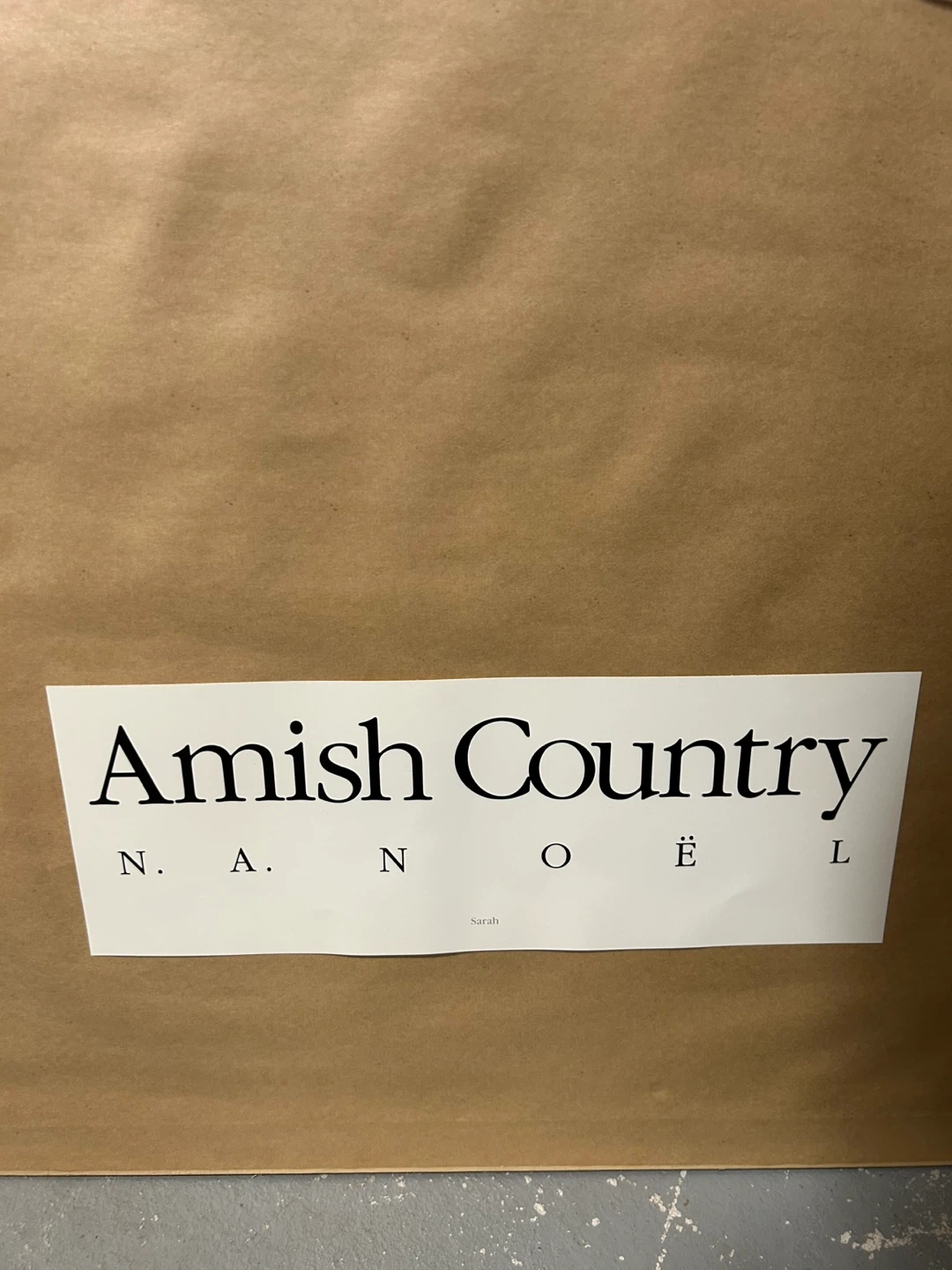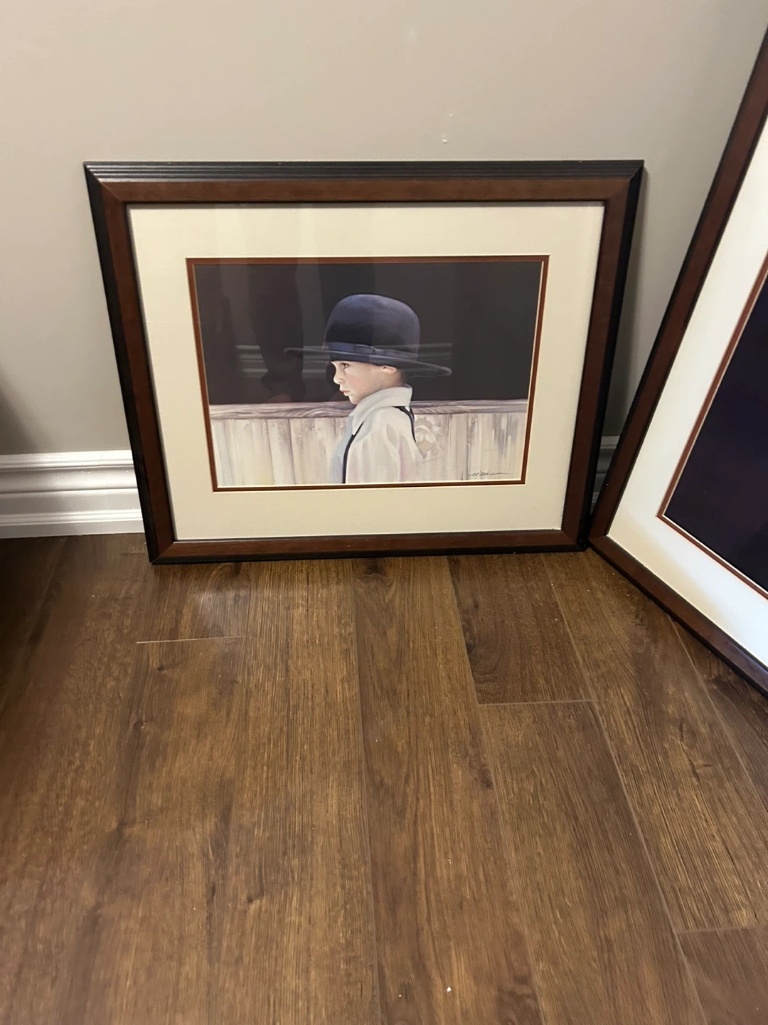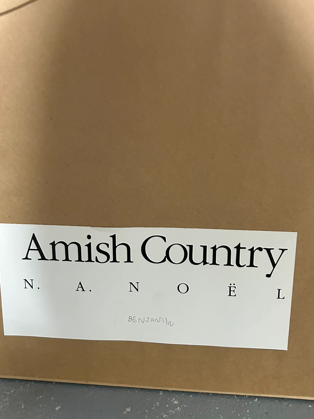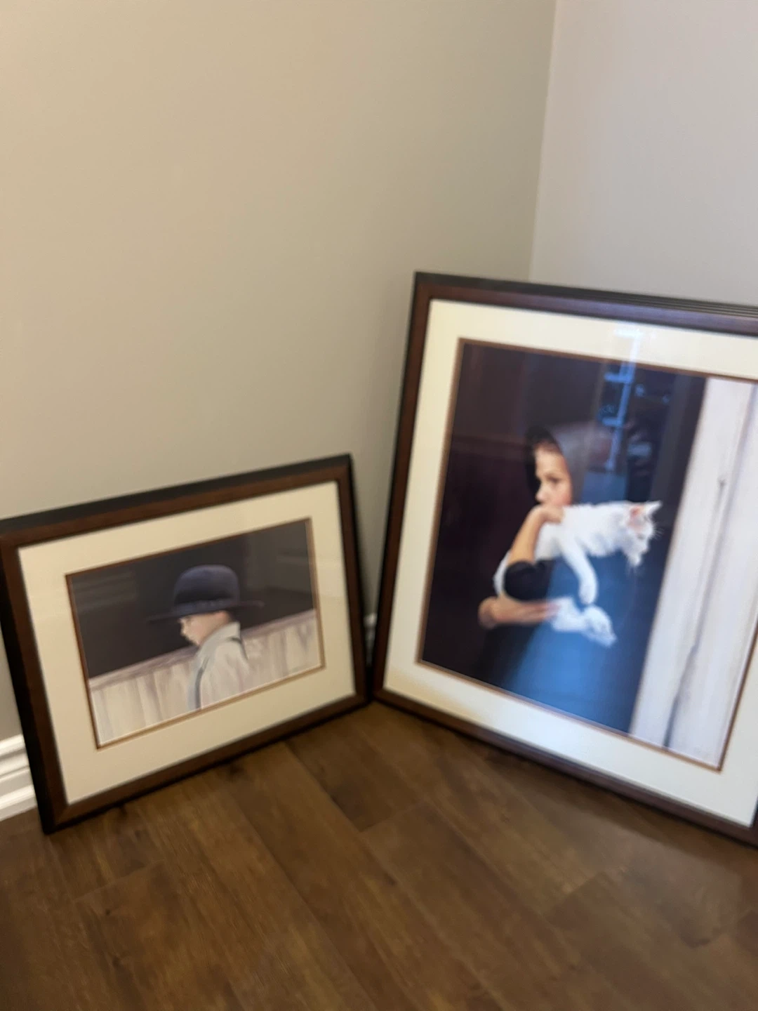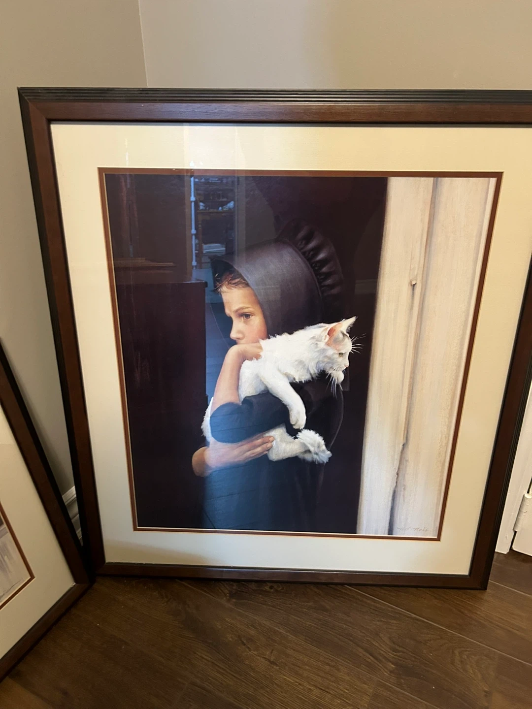 Two framed art pieces by N.A. Noel titled Amish Country. One features a child with a cat and the other features a child in a hat. Both are in excellent condition and ready to brighten up your home!