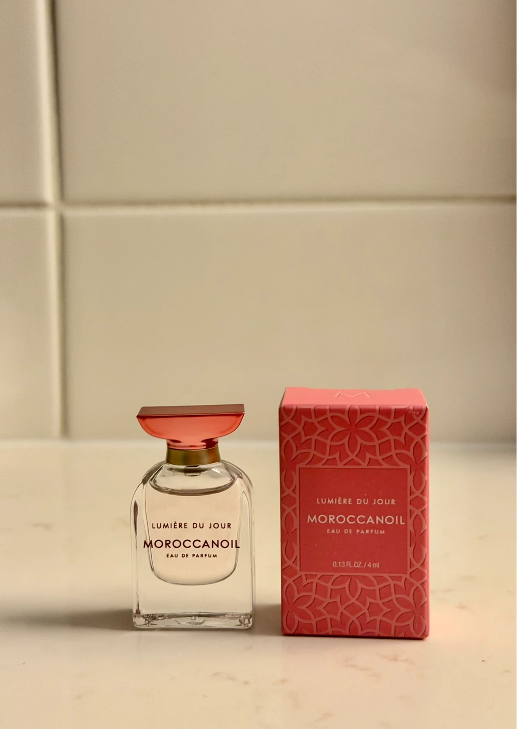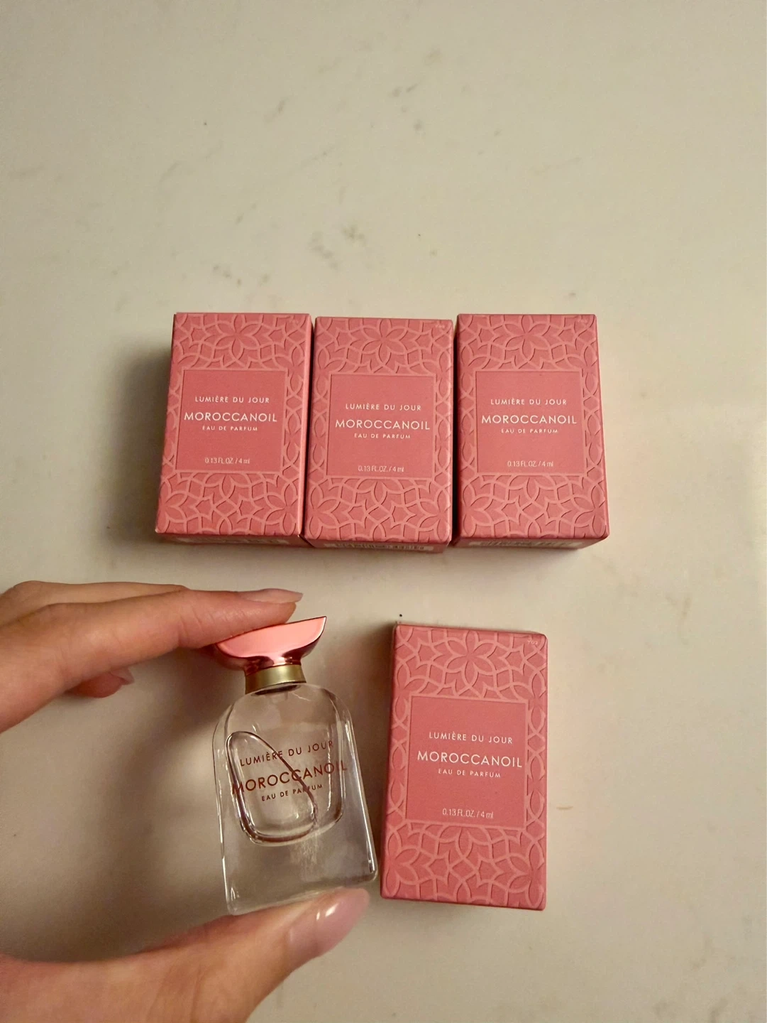 Three new, sealed boxes of Lumière Du Jour Moroccanoil Eau de Parfum, each containing a 4ml bottle. Also includes one opened bottle with its box. It's a lovely scent for everyday wear.