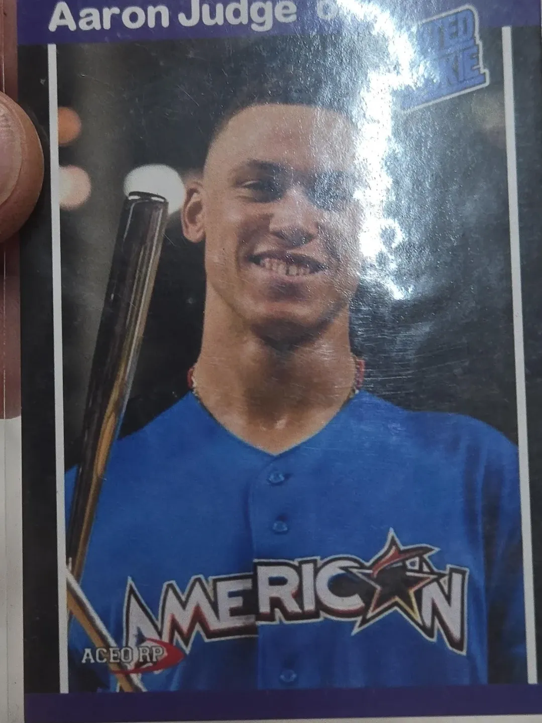 This is an Aaron Judge "Limited Rookie" baseball card. It features the player in a blue jersey with "AMERICAN" across the front. A baseball bat is visible in the foreground.