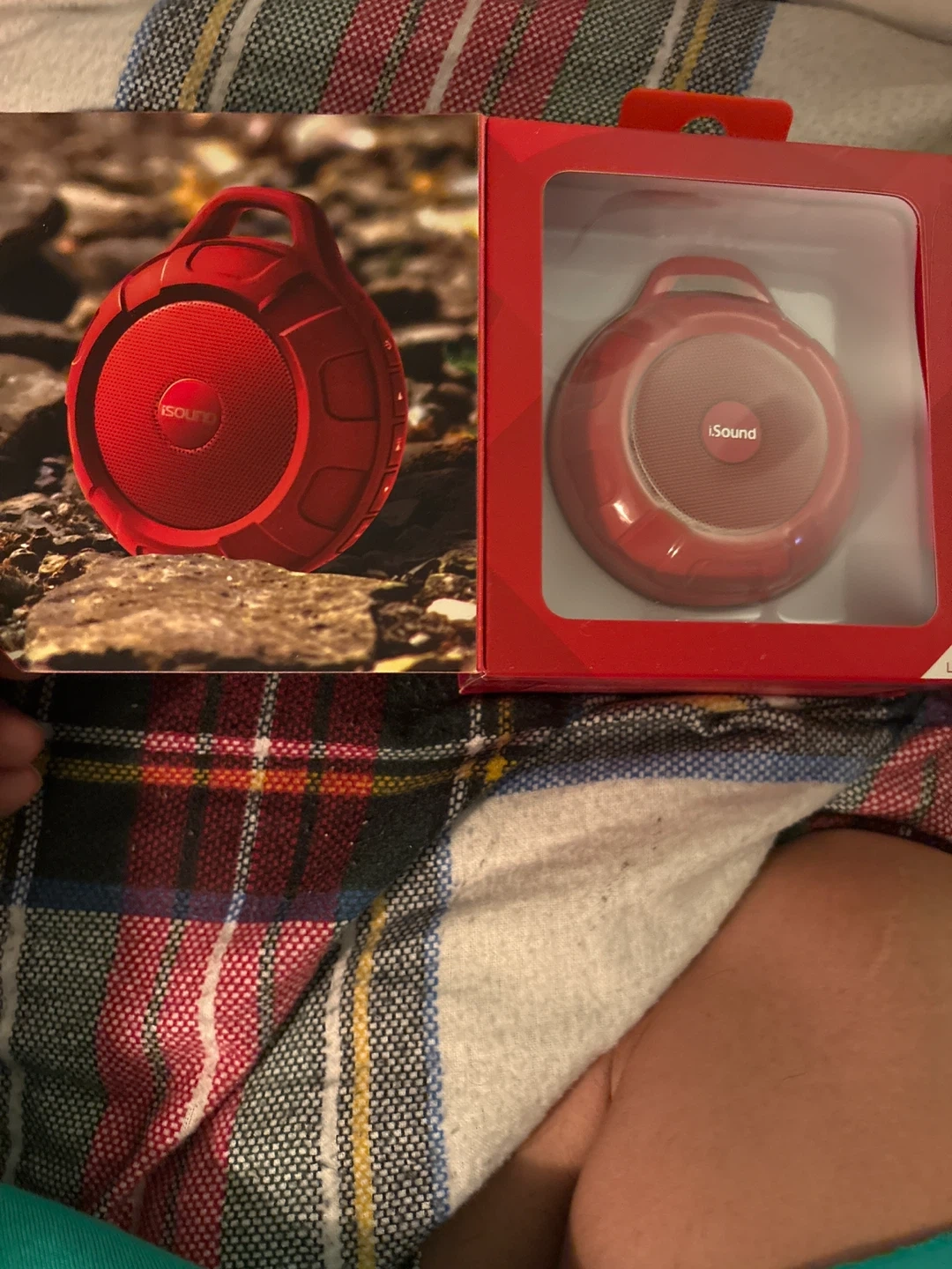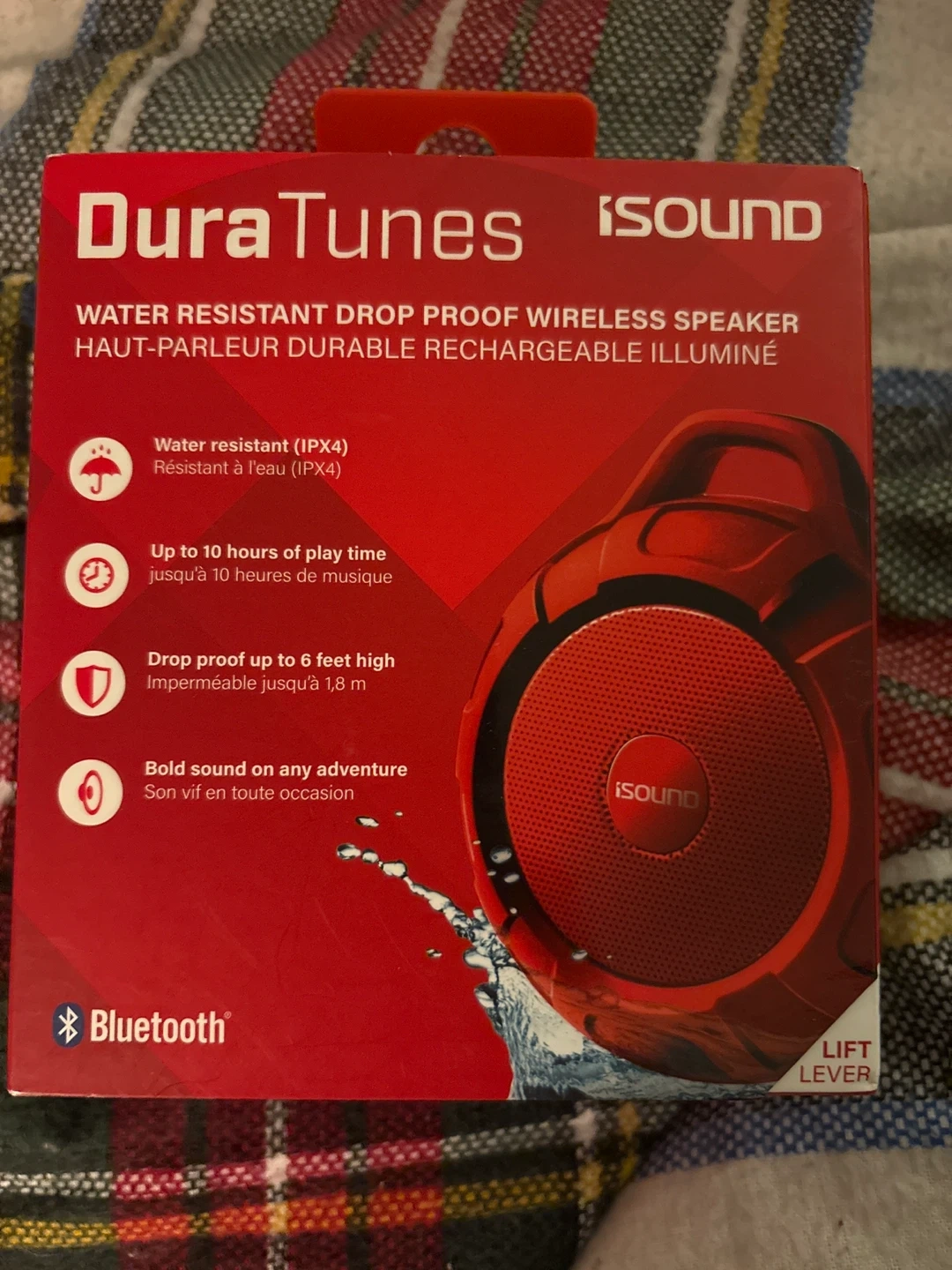This is an iSound DuraTunes water-resistant wireless speaker. It's drop-proof up to 6 feet and offers up to 10 hours of play time. It's Bluetooth enabled. Great for outdoor use! Wellington and Halsted here .