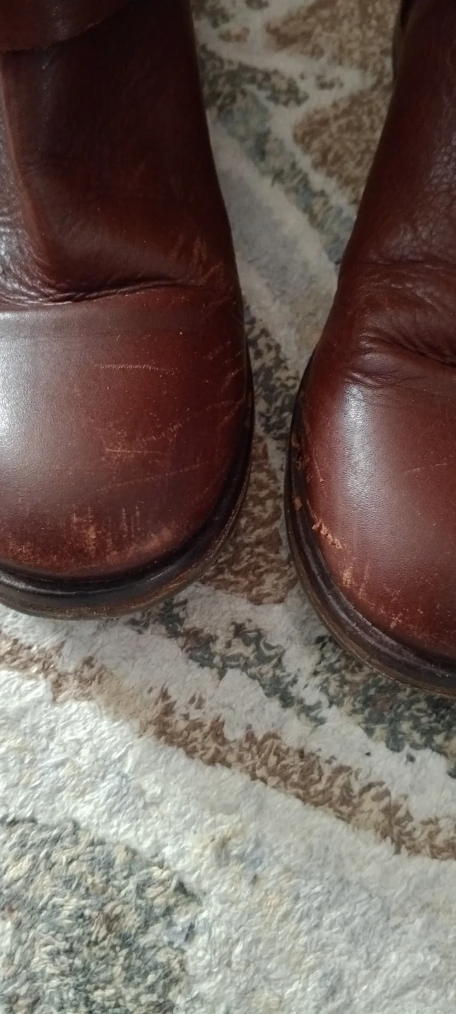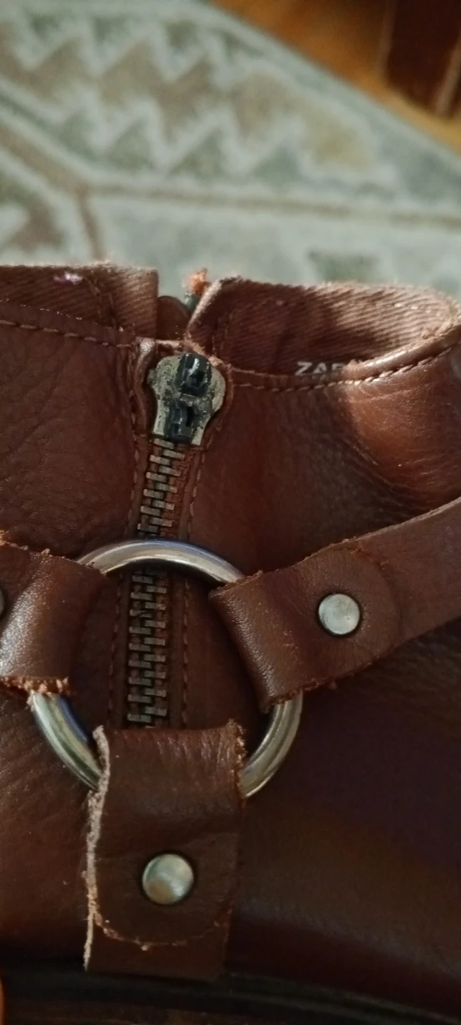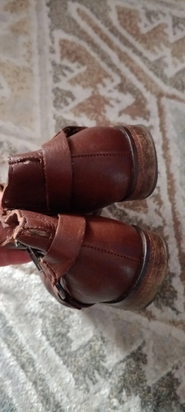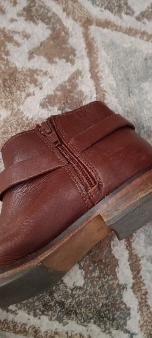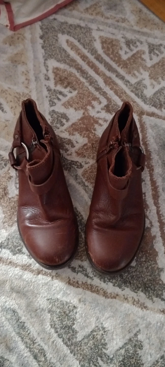 Brown leather ankle boots with a buckle detail. Zip closure on the side. Minor scuffs on the toes. Size 30.
