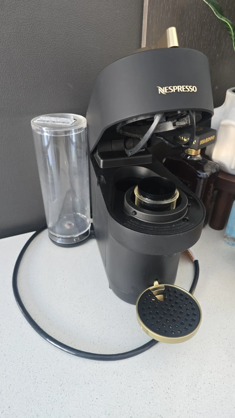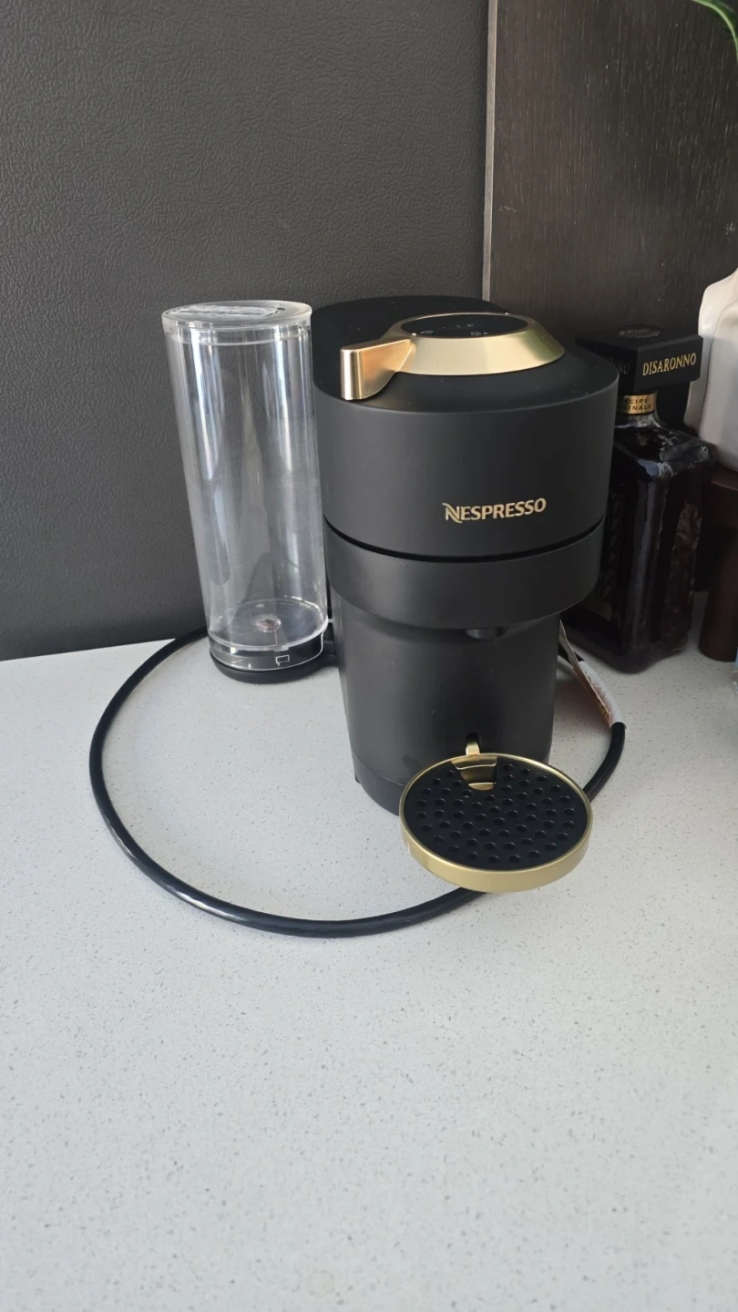 This is a black Nespresso Vertuo coffee machine. It includes the water reservoir. It's ready to make your favourite coffee drinks.