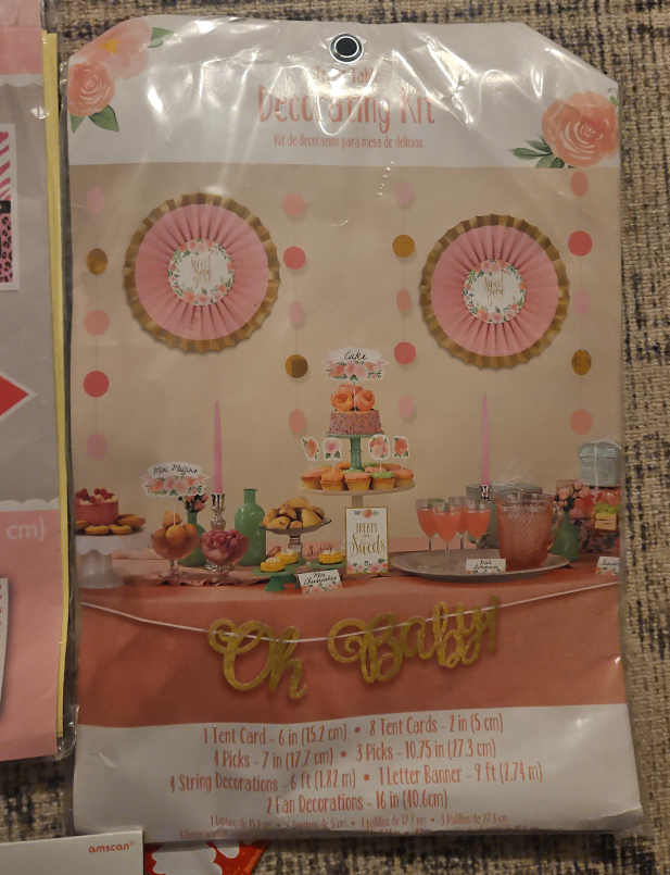 10Get ready to celebrate with this Amscan table decorating kit! It's perfect for adding a touch of sweetness to your special occasion. BNWT/packaging didn't get to have baby shower. Includes: - 1 Tent Card (6 in / 15.2 cm) - 8 Tent Cards (2 in / 5 cm) - 4 Picks (7 in / 17.7 cm) - 3 Picks (10.75 in / 27.3 cm) - 4 String Decorations (6 ft / 1.82 m) - 1 Letter Banner (9 ft / 2.74 m) - 2 Fan Decorations (16 in / 40.6cm)