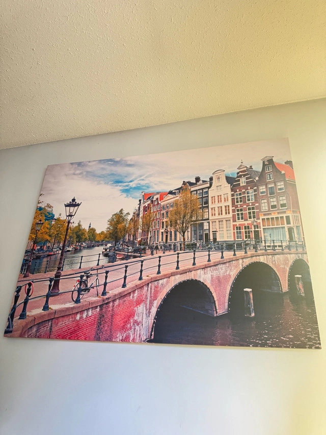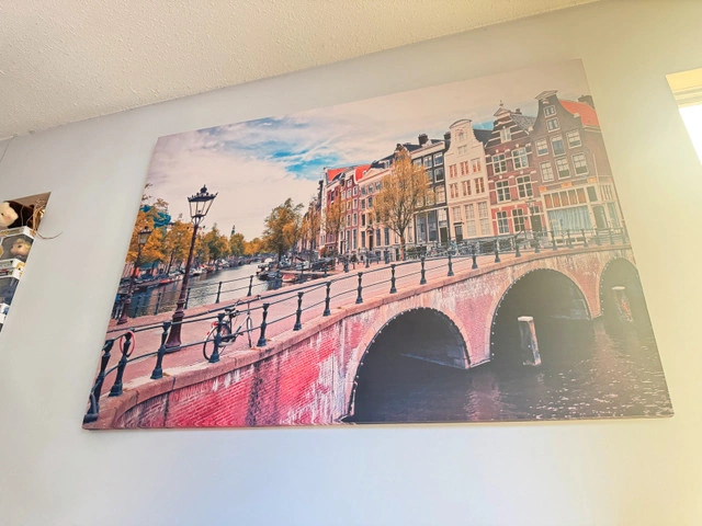 Enhance your living space with this captivating Amsterdam bridge canvas print, sized generously at 60x30 inches. This piece beautifully captures the scenic charm of Amsterdam, making it a delightful addition to any room. Please note, this print is a used item, ready to bring a touch of European elegance to your home. Key Features: * Dimensions: 60 inches in width x 30 inches in height. * Subject: Picturesque Amsterdam bridge scene. * Condition: Used, but well-maintained, offering an affordable way to own a large-format art piece. Pick up only