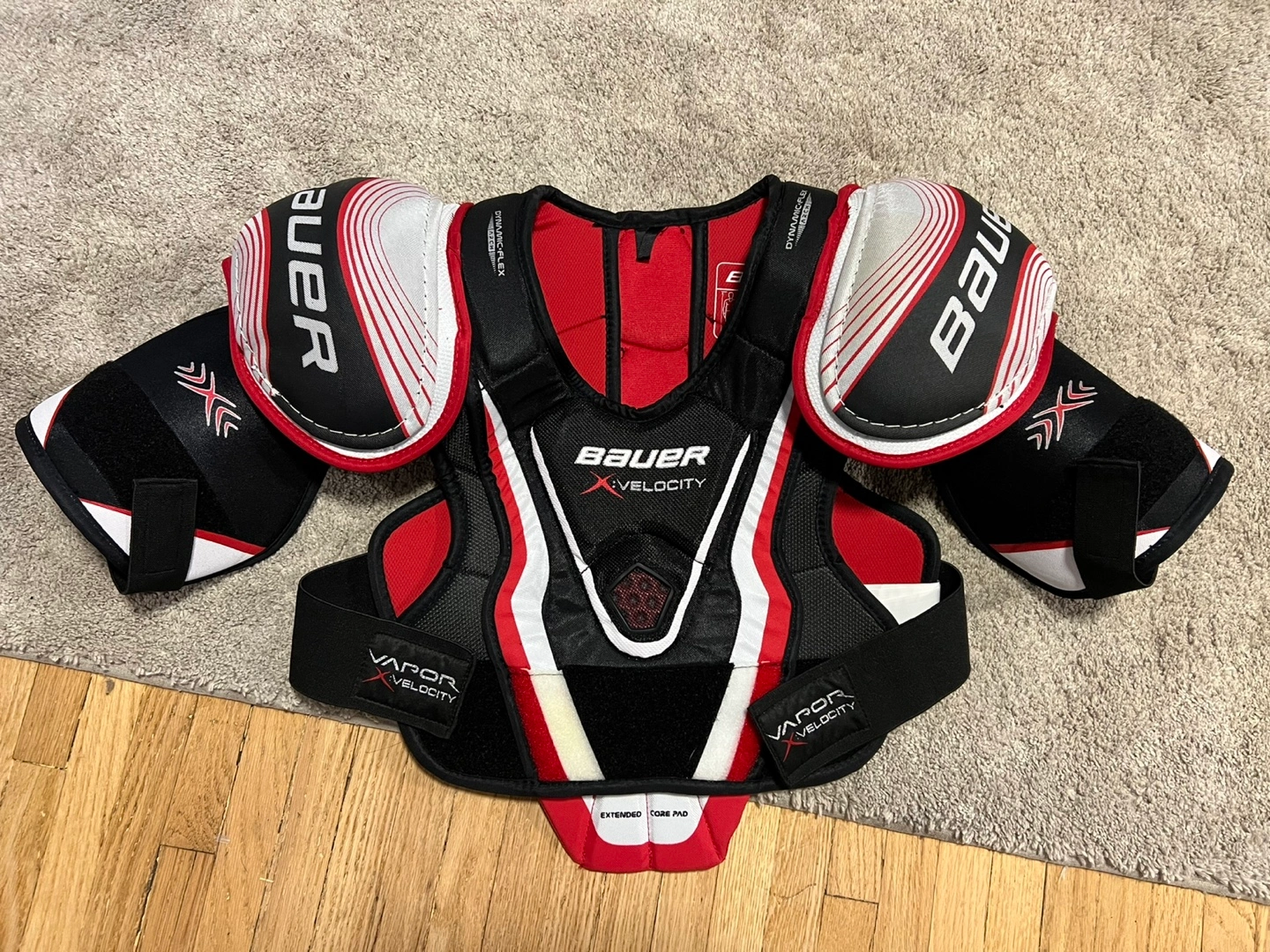 Bauer Vapor X Velocity senior hockey shoulder pads. Size medium/medium. Red, black and white. Excellent protection. Great condition.