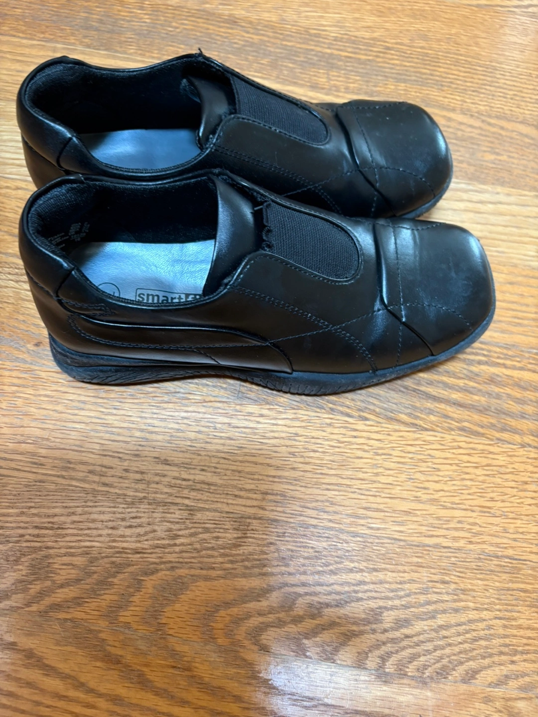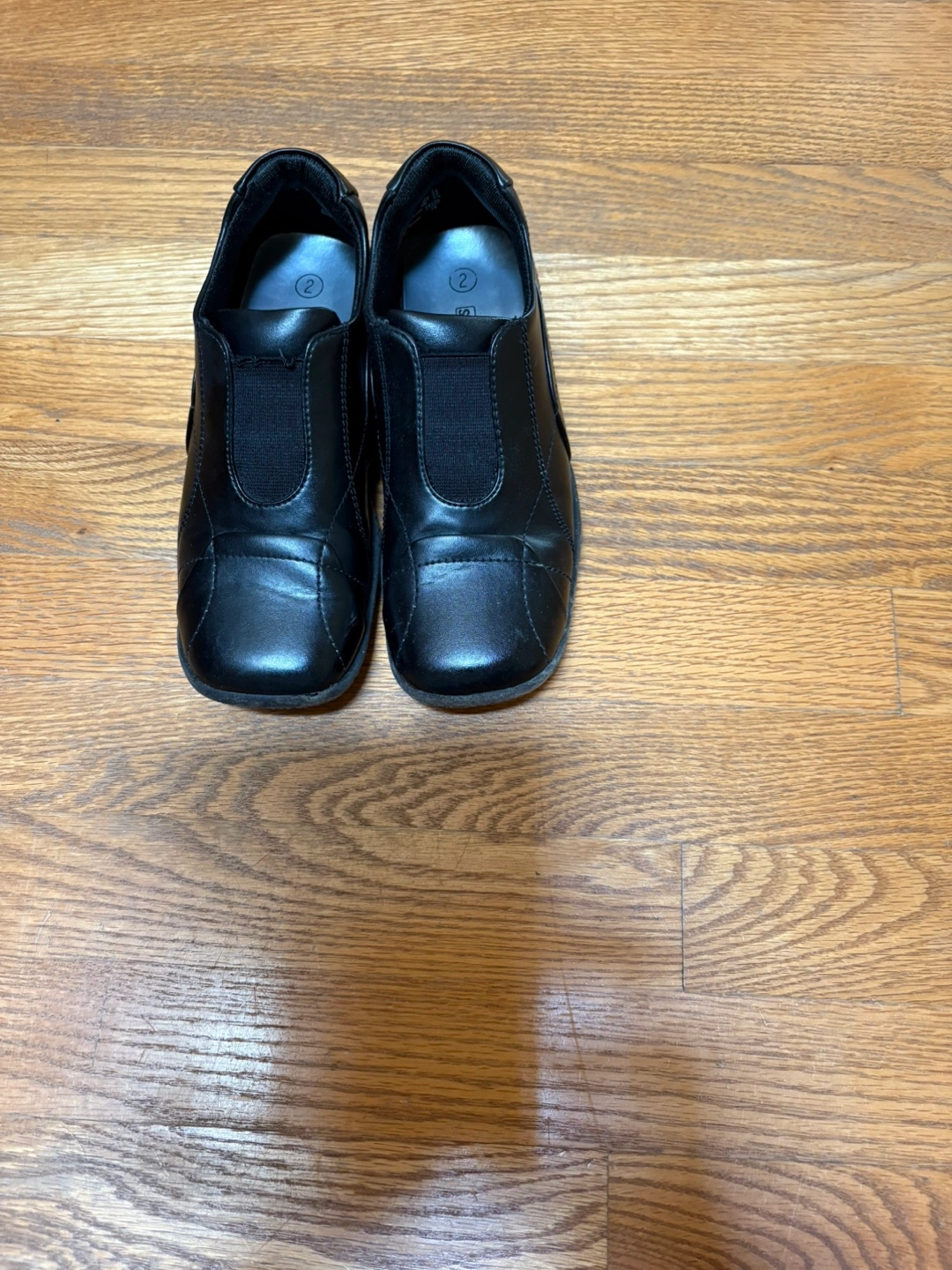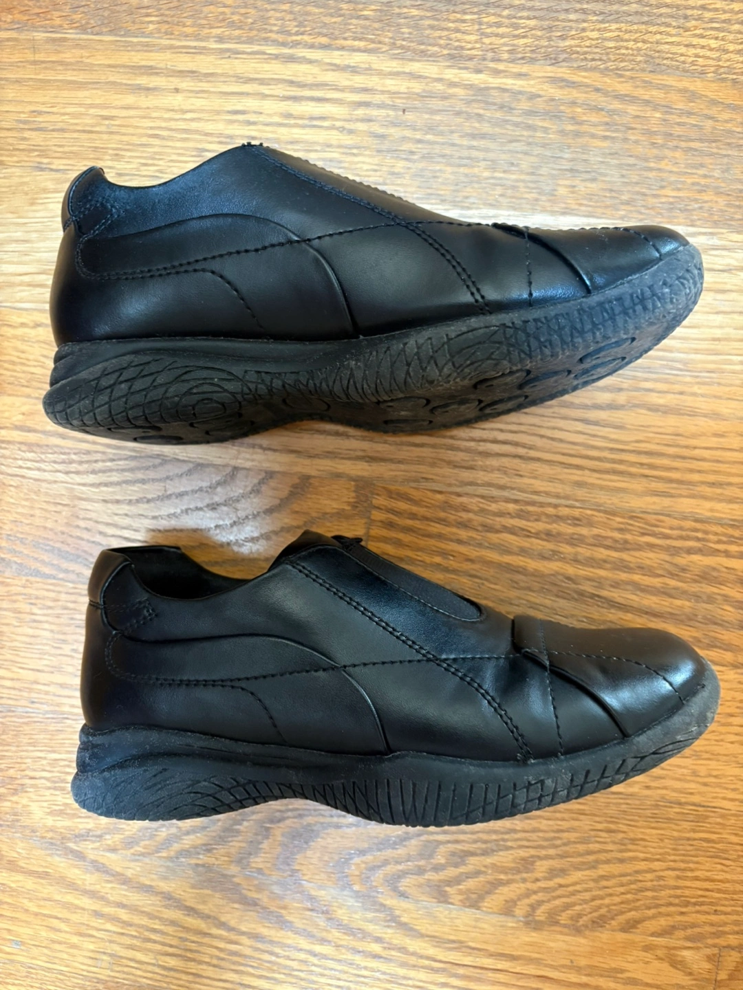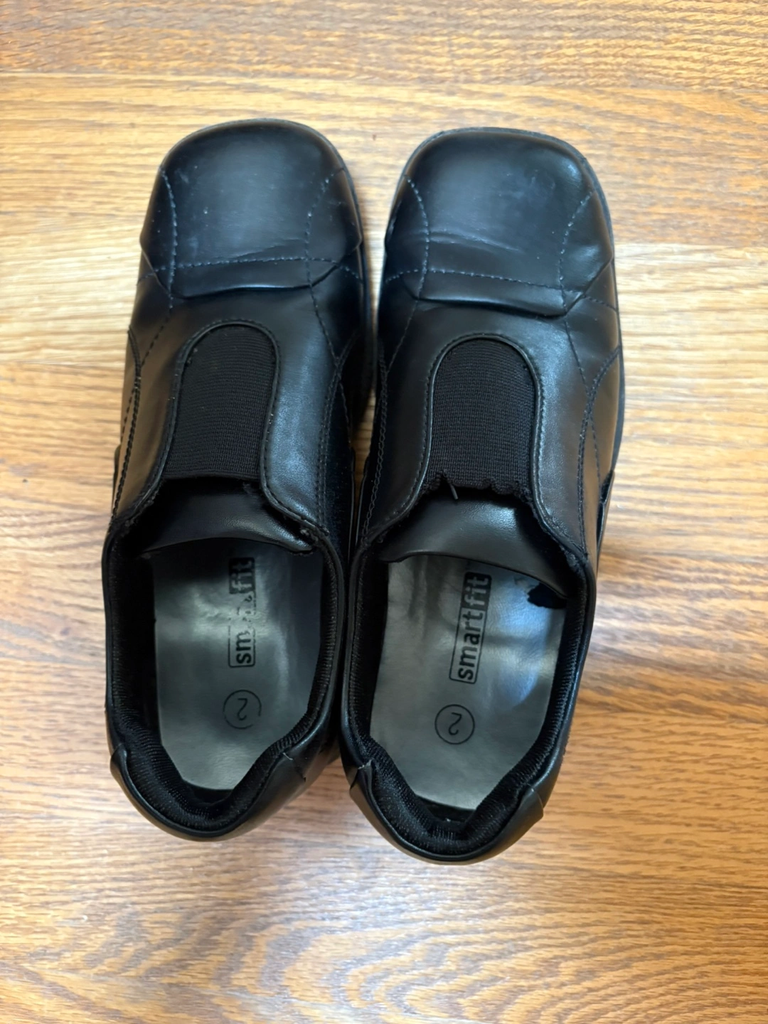 These Smartfit black quick-on and quick-off shoes are a Size 2 and great for school or play. The shoes are skid resistant and are in very good condition. They are made of quality leather and man-made materials with arch support, cushioning, extra toe room and durability.