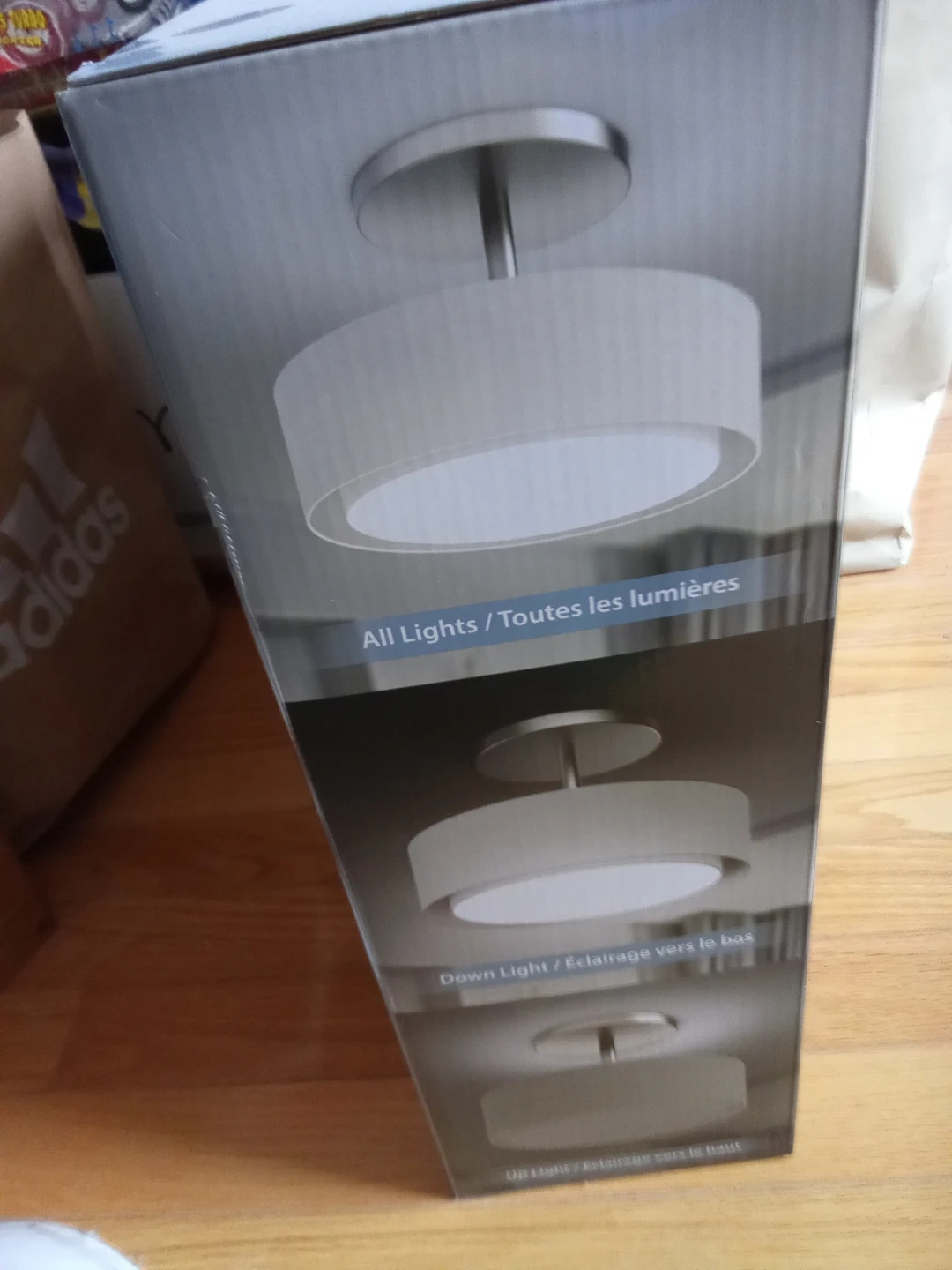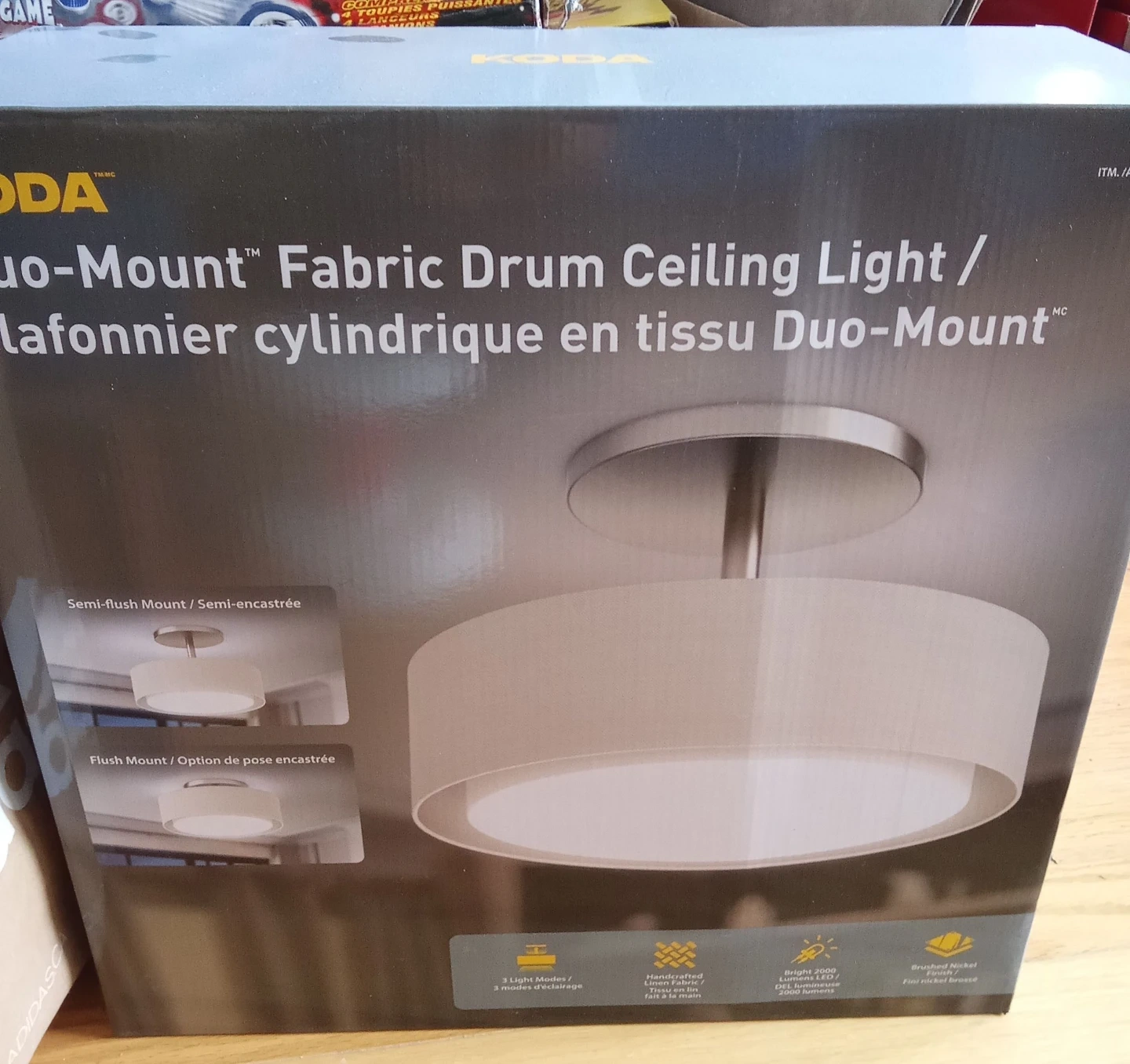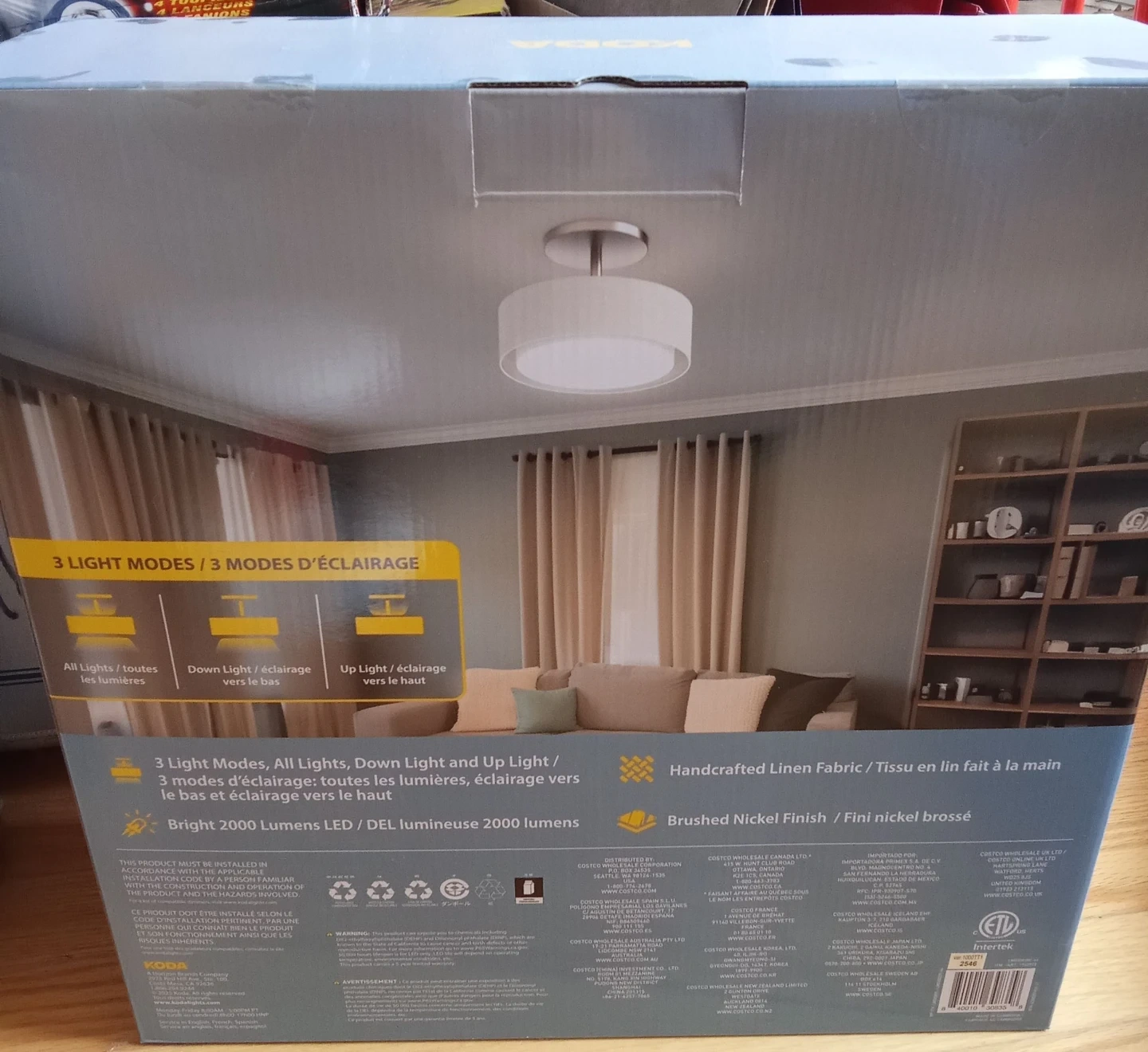 This KODA ceiling light offers 2000 lumens with adjustable color temperatures of 2700K/4000K. It's dimmable and has a rated lifespan of 50,000 hours. Features include brushed nickel finish and handcrafted linen fabric. This light provides all lights, down light, and up light options.