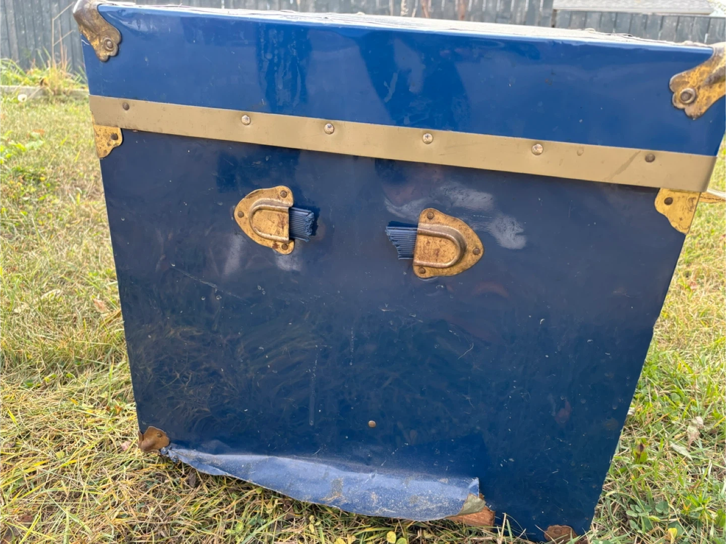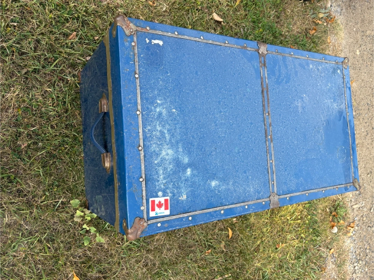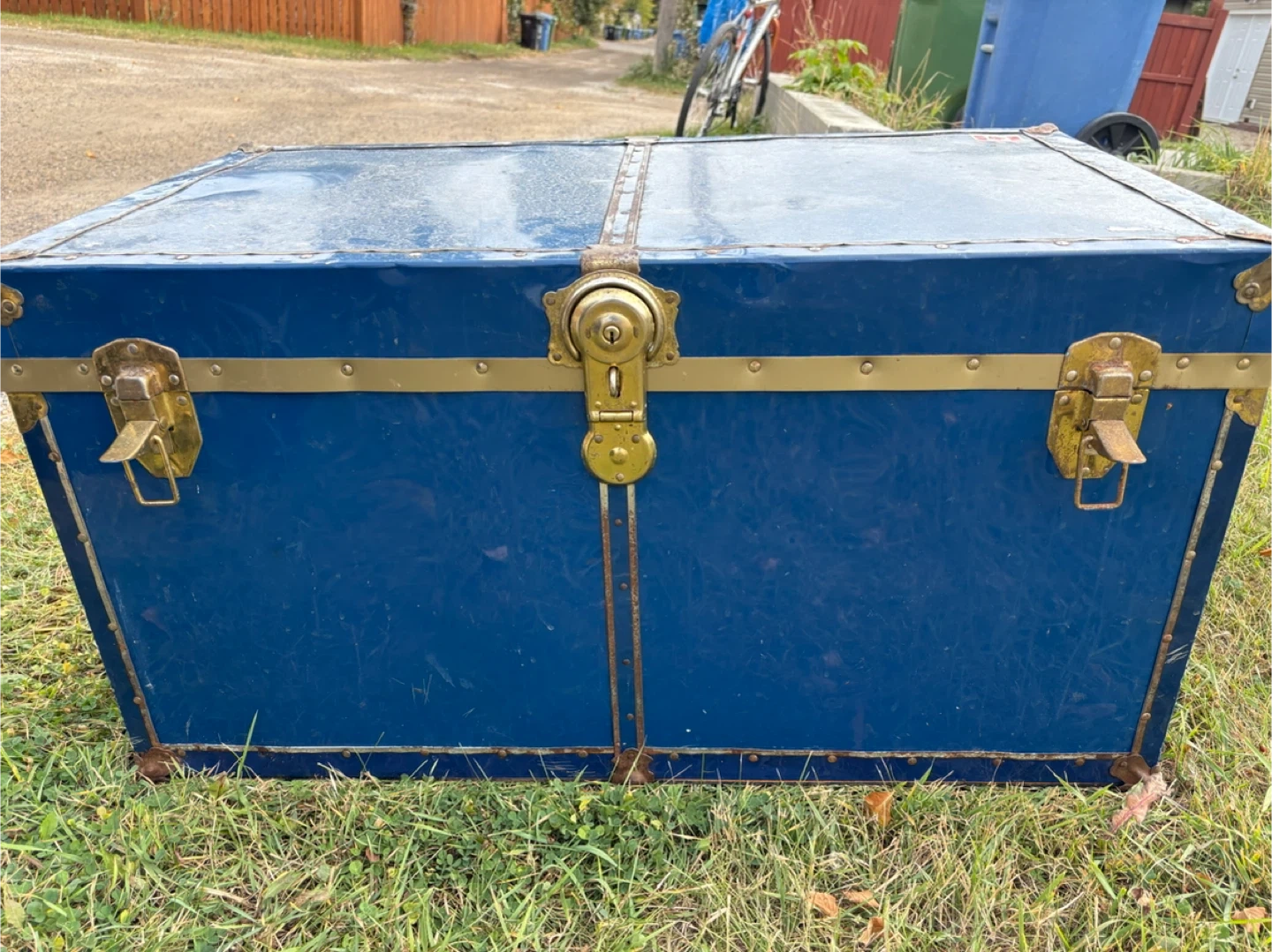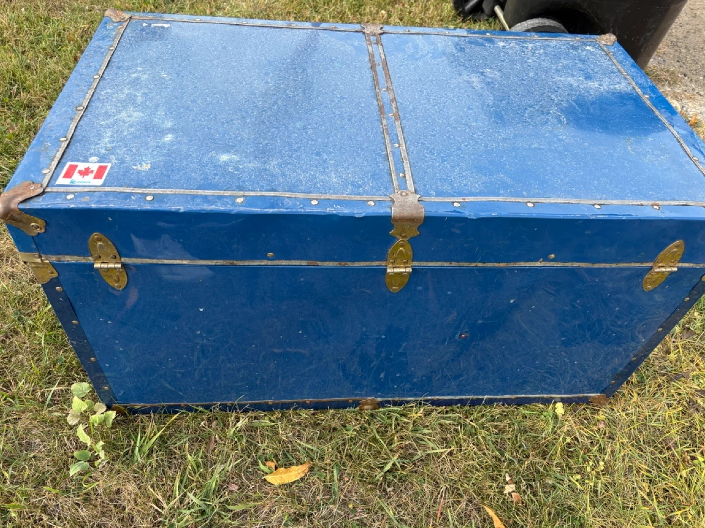 An old tin box , big and a little heavy. iron sheet in one side has some broken, sorry the key is lost so you need to broke it to use again. It can use to storage in garage. Pick up at Morley trail NW