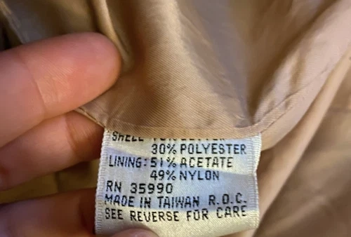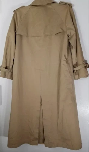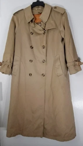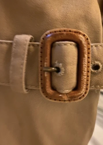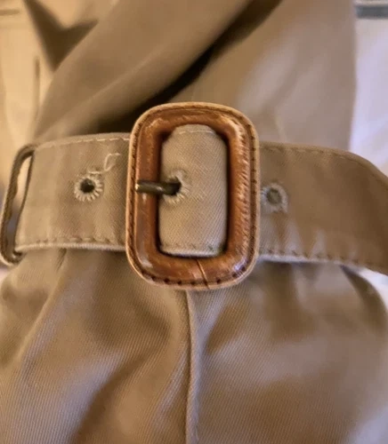 Pre-owned in good condition with a small stain on the inside of the right lapel, small tear on the inside of the right wool lining, and a loose button on the upper right inside corner. Slight wear and tear on the buckles. Size unknown but fits like an 8-10.
