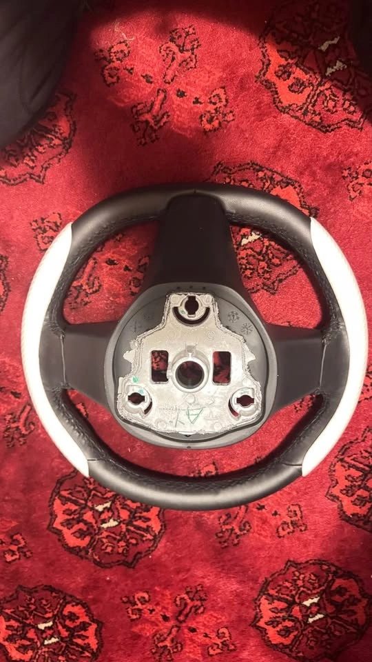 Original Tesla steering wheel for Model 3 Performance (2020). Leather is in perfect condition. Includes two removable white carbon fibre covers (aftermarket).