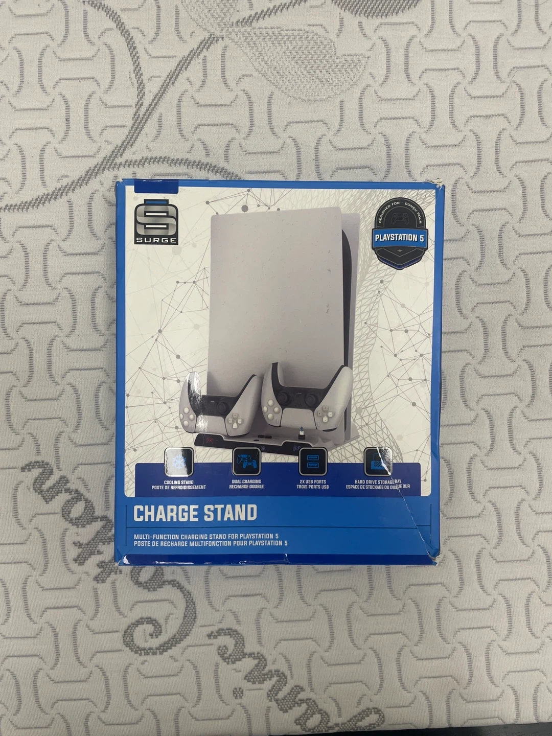 This Surge charge stand is designed for PlayStation 5. It includes a cooling stand, dual charging for controllers, two USB ports, and a hard drive storage bay. It's a multi-function accessory for your console!