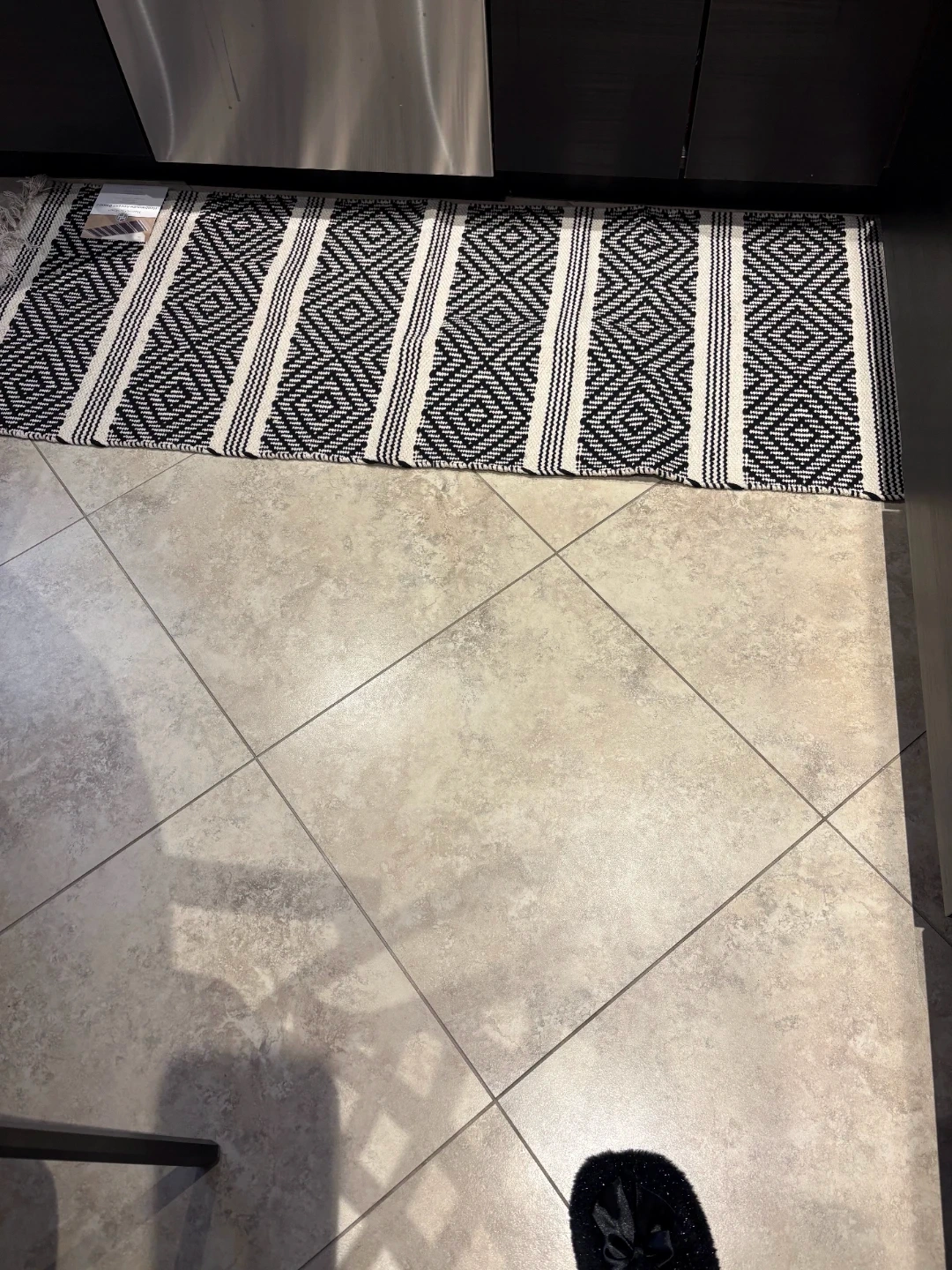 This rug features a classic black and white geometric pattern with striped borders. It's suitable for entryways or kitchens. Adds a touch of style to your floors!Pick up Lower Stoney Creek near Millen Rd