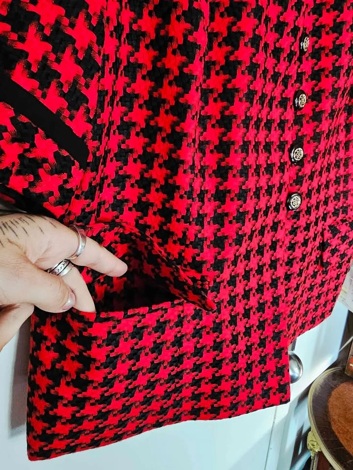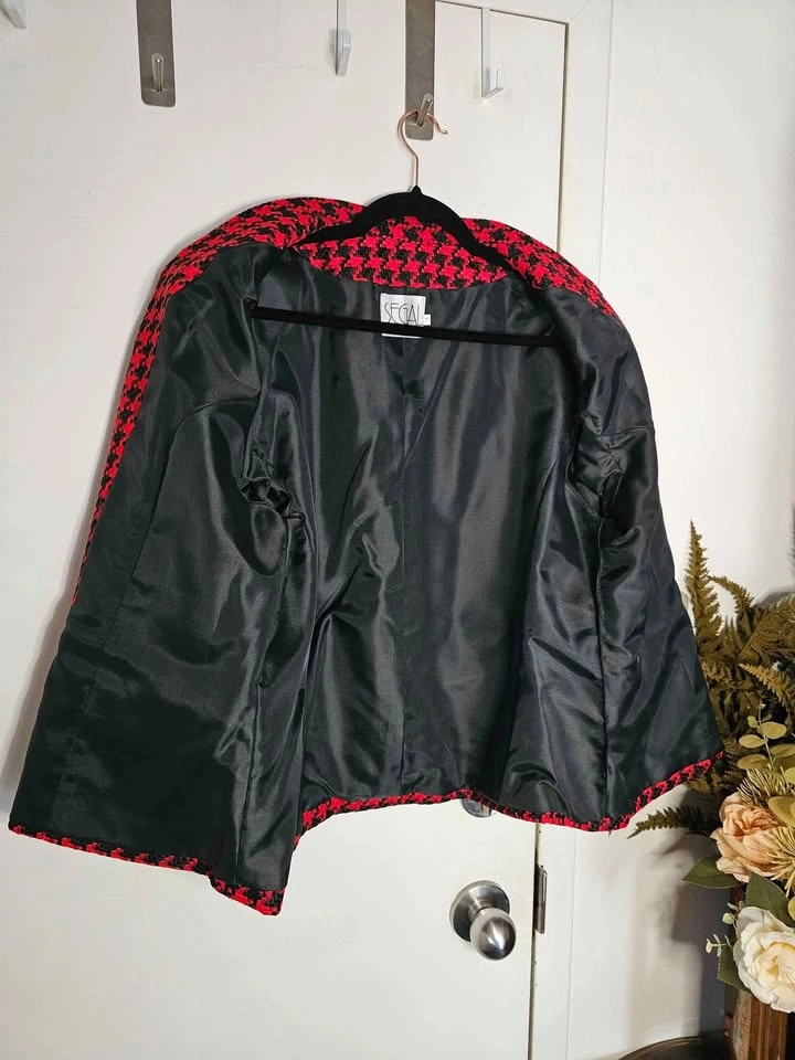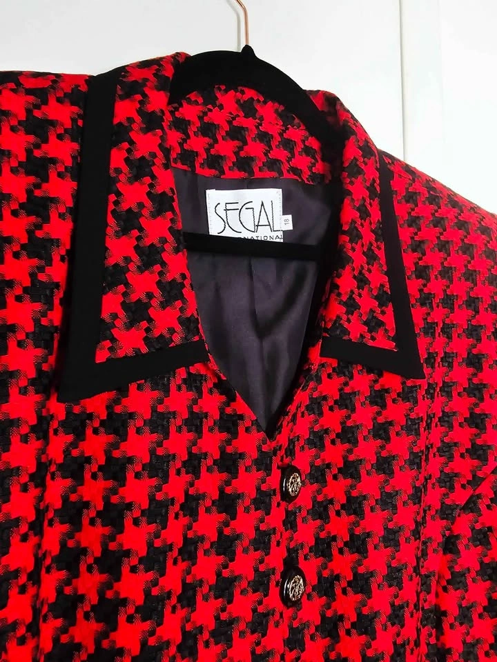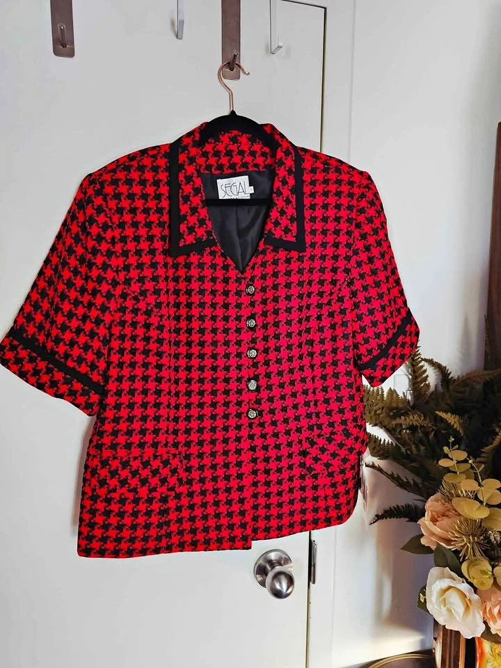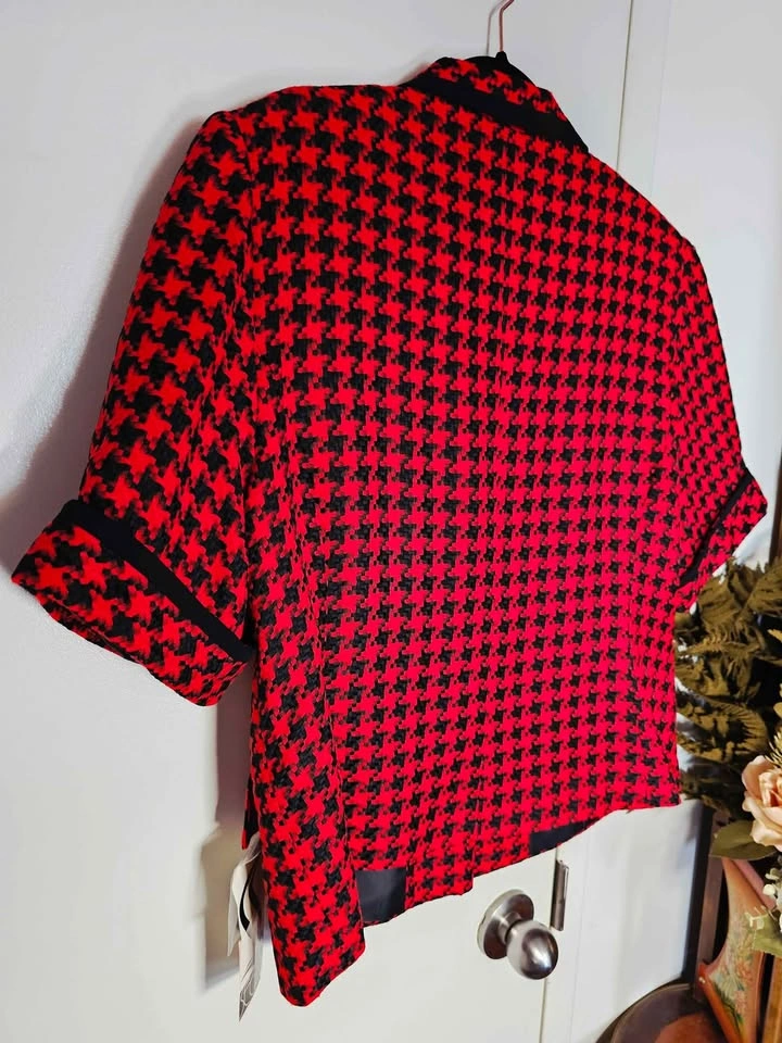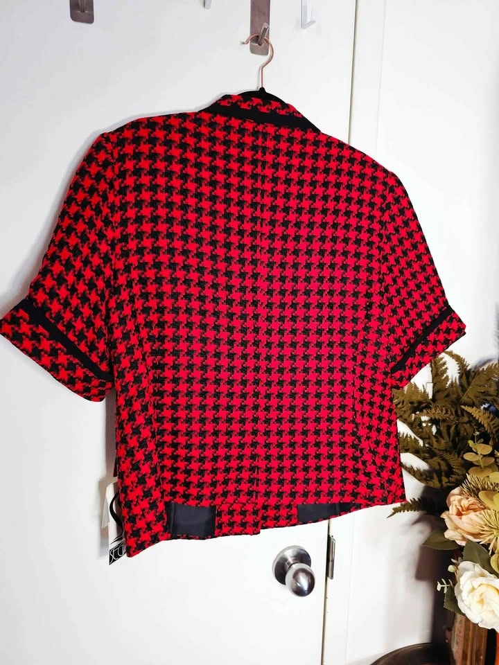 True vintage deadstock from the 1980s, brand new with tag and in new condition! This lovely short sleeve French style blazer jacket is made of a woven red and black houndstooth material, with black trim at the collar and sleeves and black and gold accent buttons. It has 2 flap pockets at the front, and is fully lined with a poly lining. It has shoulder pads that are sewn in under the lining. Blazer is made by Segal International, and it retailed for $154 in the 1980s, which is equivalent to almost $500 adjusted for inflation now. It is tagged as a size 18, but please check the measurements to be sure it will work for you. Pit to pit measures about 22", waist measures about 21", and shoulder to bottom hem measures about 24". semi-formal dressy dinner church business office