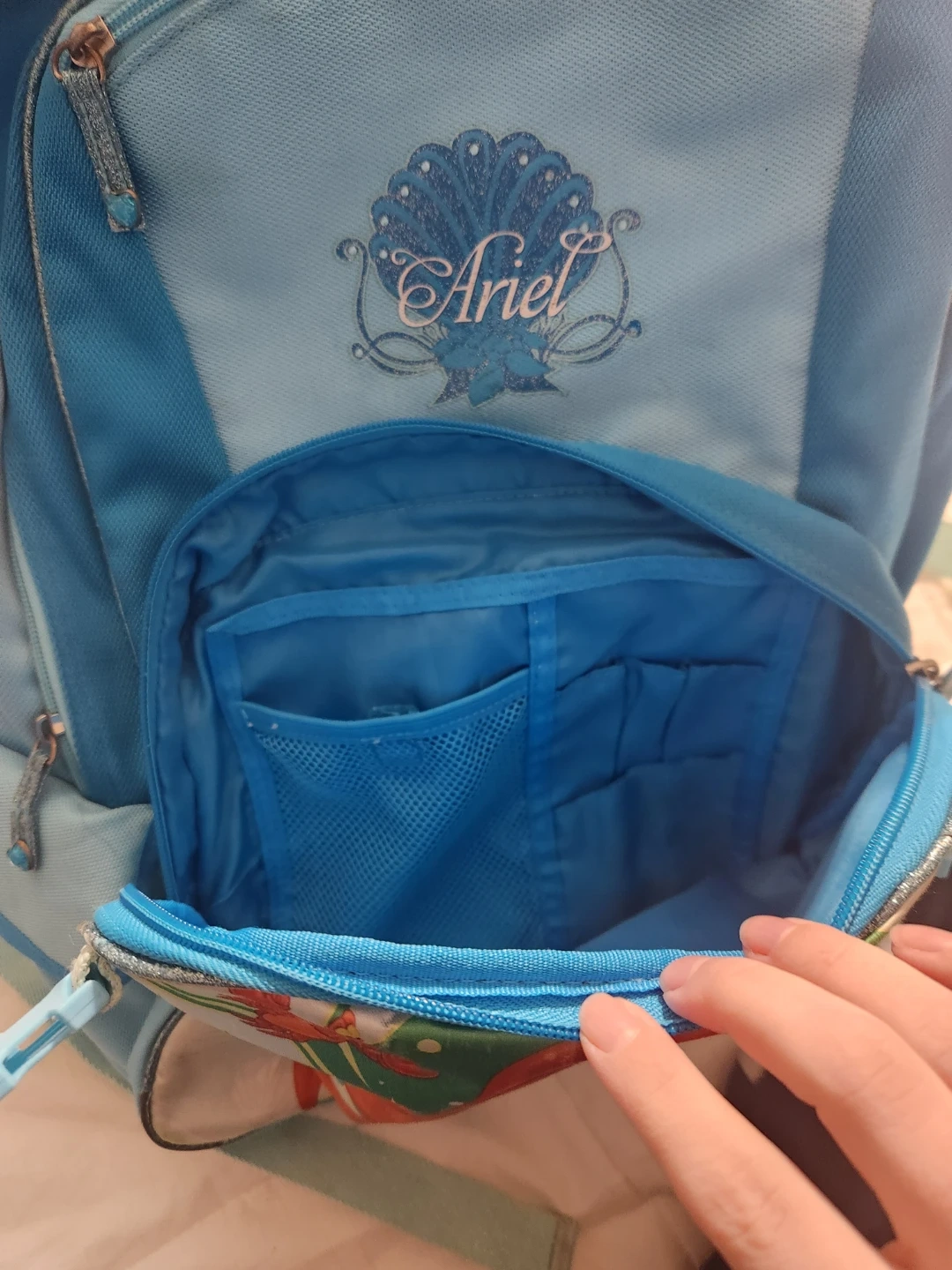 The Little Mermaid backpack. It has multiple compartments, including a front zipper pouch with internal mesh pockets.