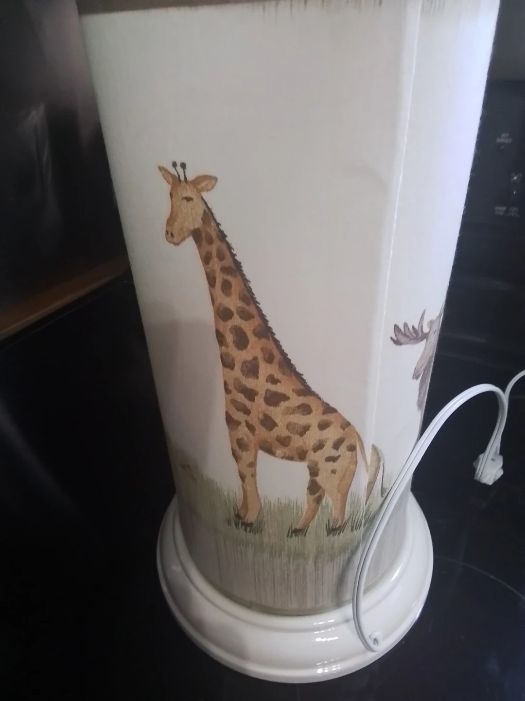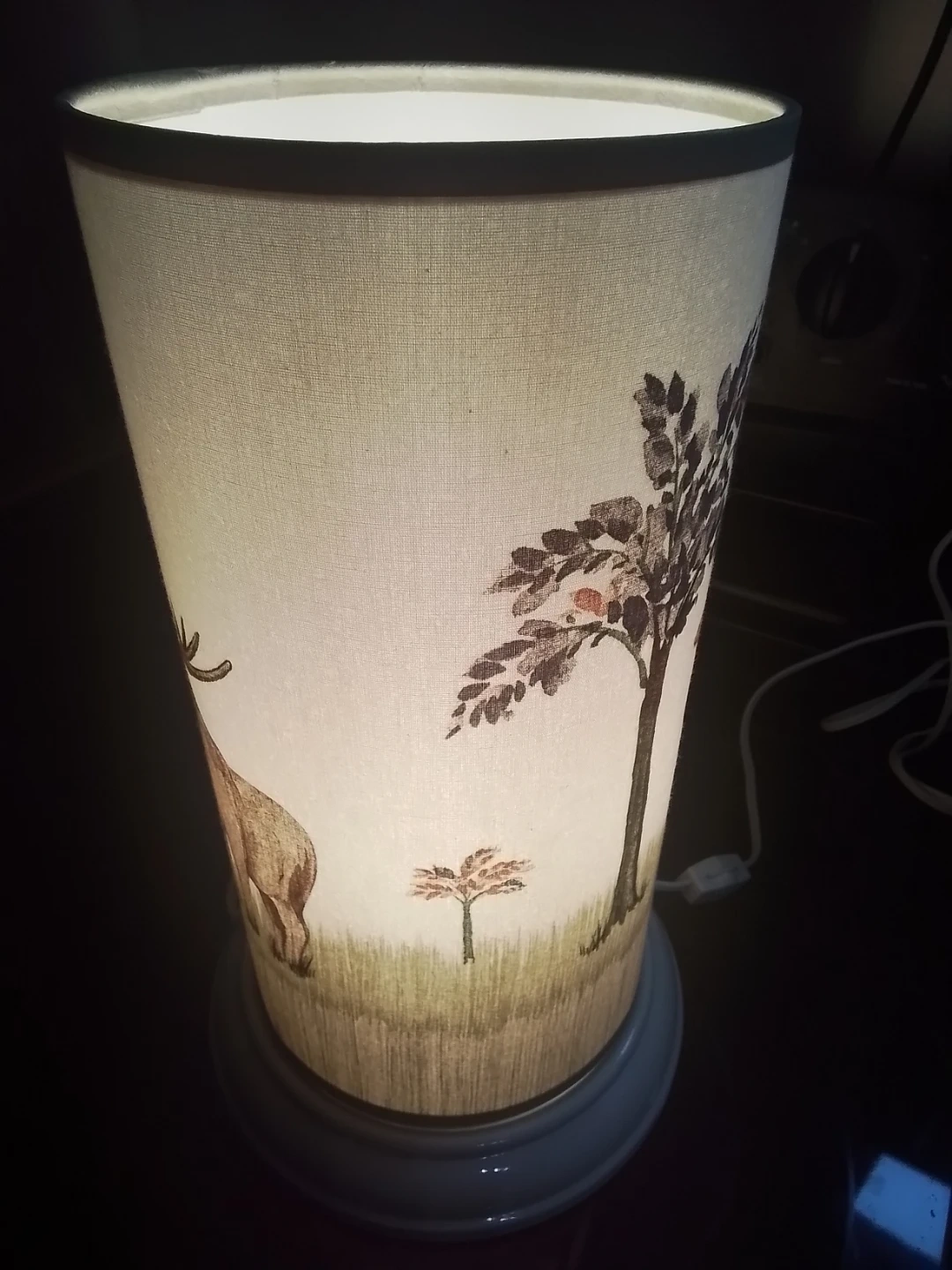 Brighten up any room with this unique vintage cylindrical table lamp, showcasing charming camel, moose, giraffe and tree designs, sized at 8x13.5 inches; it's in good working condition. This gently enjoyed lamp would love to find a new home.