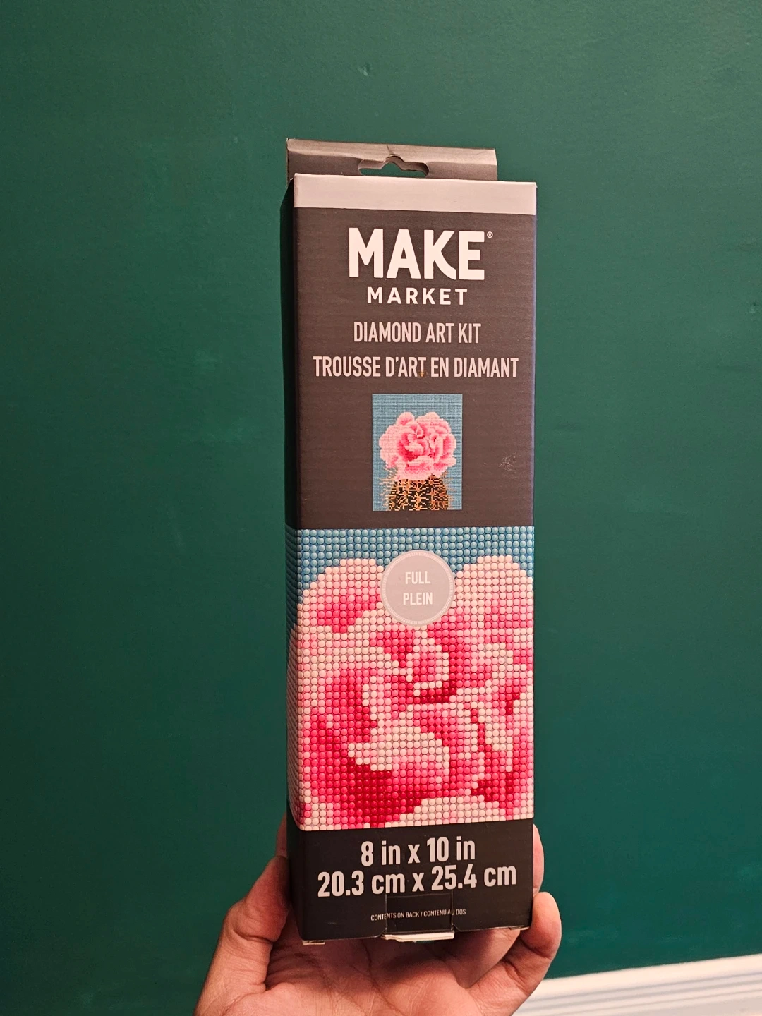 This MAKE MARKET Diamond Art Kit features a 'Cactus Flower' design. It measures 8 by 10 inches (20.3 cm x 25.4 cm). The kit includes pre-printed canvas, diamonds in 25 colours, stylus grip cover, wax caddy, and instruction sheet.