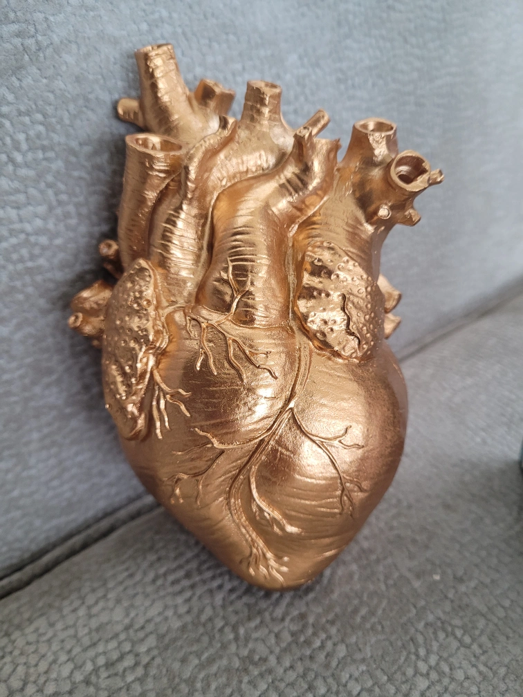 Selling a detailed anatomical heart model in a striking gold colour! It's a unique piece, perfect for adding a touch of medical curiosity to your space or as a gift for someone in the field. The model appears to be in great condition and showcases the intricate details of the human heart