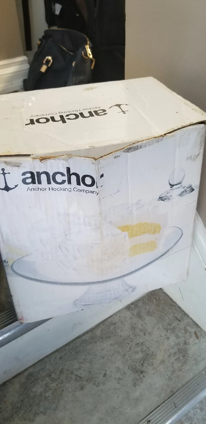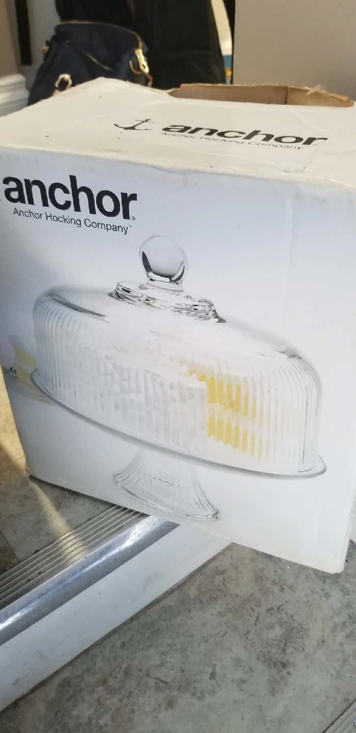 Selling an NEW Anchor Hocking pedestal cake dome. It's the perfect blend of function and design, made with essential glassware of crystal clear quality. Includes a glass cake pedestal and glass cover. Box is included. opened but new.