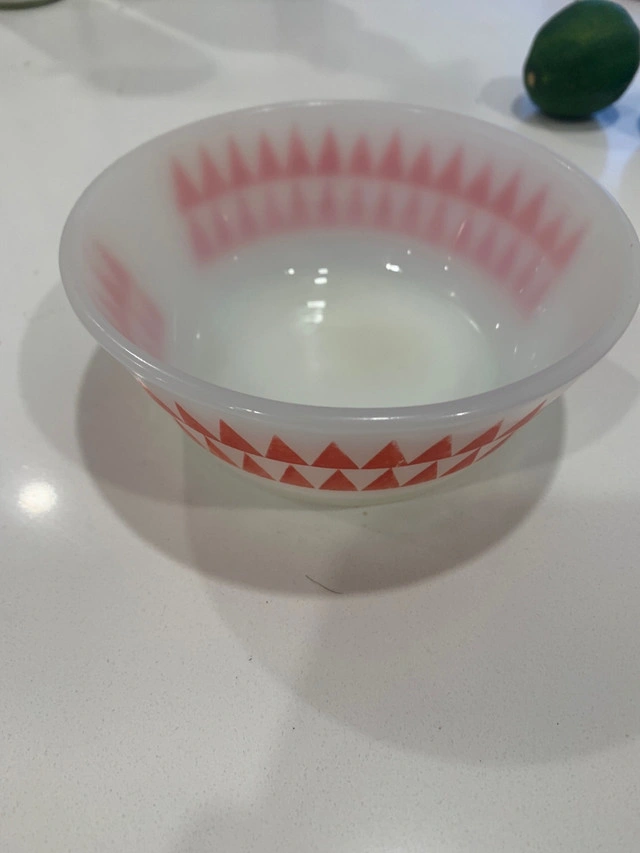 This Anchor Hocking bowl features a striking red and white pattern, perfect for collectors or anyone who appreciates vintage kitchenware. The bowl is in good condition, with the usual wear for a piece of its age. * Brand: Anchor Hocking * Pattern: Red and White Geometric * Type: Bowl * Vintage: Yes This bowl is a delightful piece of nostalgia, ready to bring a touch of retro charm to your home. Also, just so we're clear, if you're reading this, it's still up for grabs! Based on similar Kijiji listings, a fair price for this bowl is between $15 and $30 CAD.
