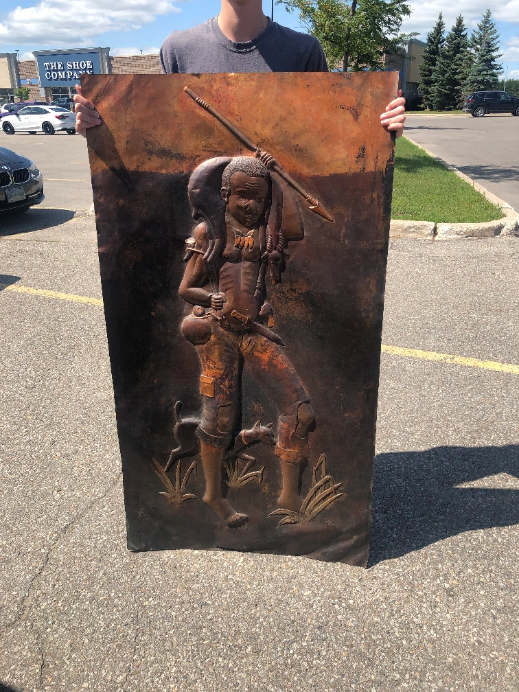 Absolutely huge almost 5 FEET by 2,5 feet (57” x 31” )size (145 cm by 80 cm)style: 1940-1960 Copper Relief African Art original signed by Andala. !!! ORIGINAL !!! Ultra rare piece of art offered to true collector.You will never find one of this size so act fast and serious. No offers and NO HOLDS unless prepaid by E- transfer. Due to size I will offer delivery for extra $$$ depending on location. link to similar small size here : e baycouk Antique Painting Copper Repousse Scene Africa Chasse Art African Sign Andala