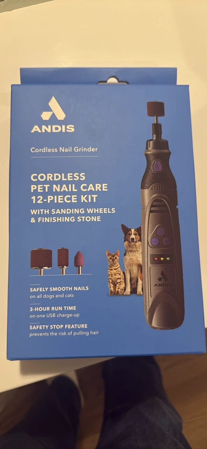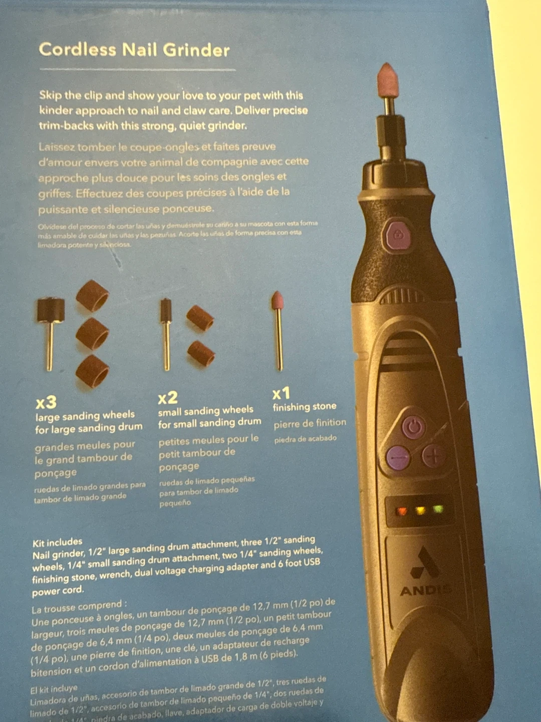 23Keep your pet's nails trim with this Andis cordless nail grinder! This 12-piece kit includes sanding wheels and a finishing stone for a smooth, safe trim. It has a 3-hour run time on a single charge and a safety stop feature to prevent pulling hair. Comes with the original box and all components!