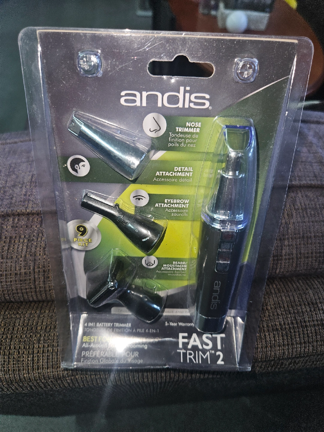 10Selling an Andis Fast Trim 2, it's a 4-in-1 battery trimmer designed for all-around facial grooming. This is a 9 piece kit, trusted by professionals and families since 1922. It includes attachments for nose, detail, eyebrow, and beard/moustache trimming. Comes with a 5-year warranty