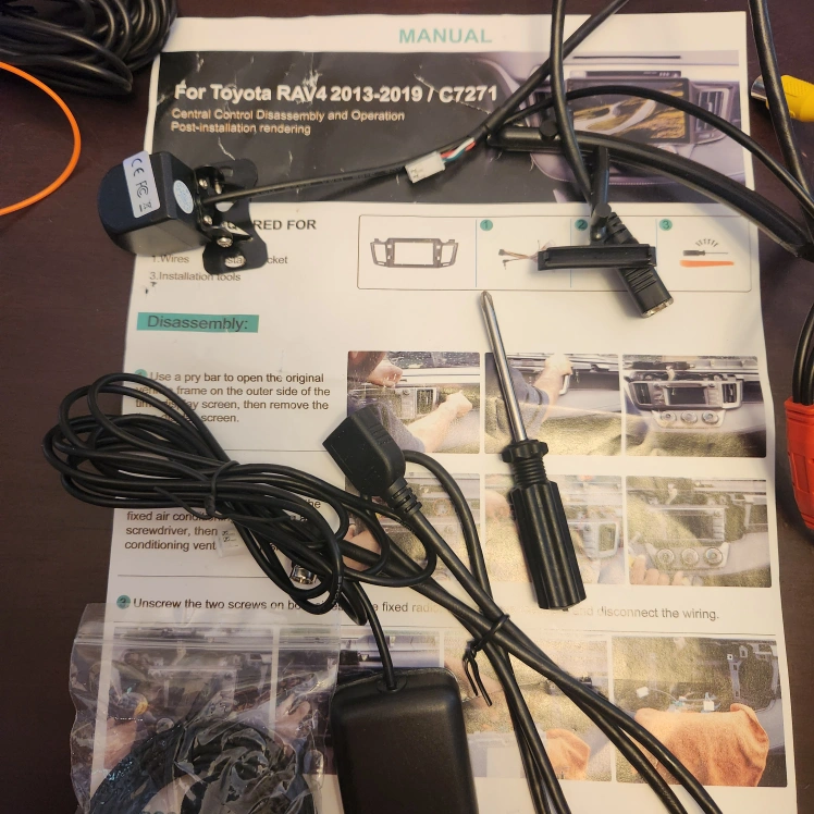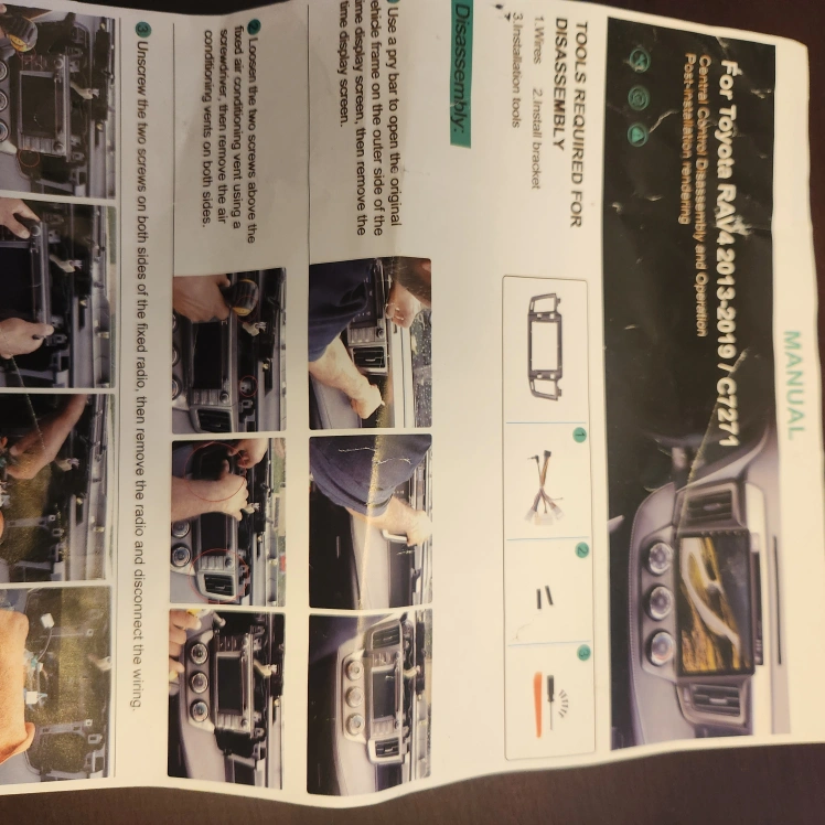Selling an Android Car Media Player designed for Toyota RAV4 models from 2013 to 2019. It comes with the user's manual and all the necessary wires and tools for disassembly and installation. Perfect for upgrading your car's entertainment system!