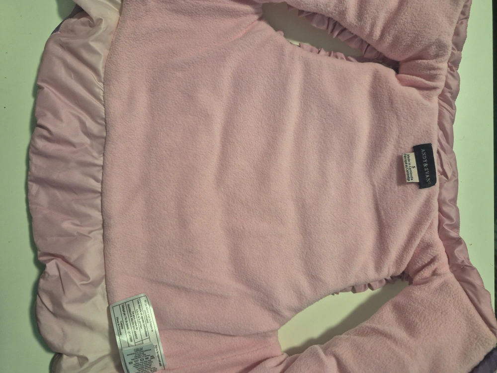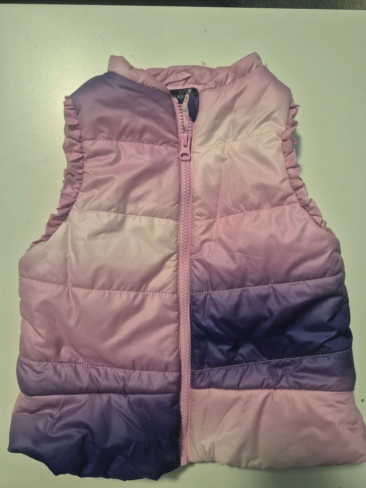 15This is a cute girls' puffer vest from Andy & Evan in size 5. It features a lovely ombre design in shades of pink, purple, and white. Perfect for layering!