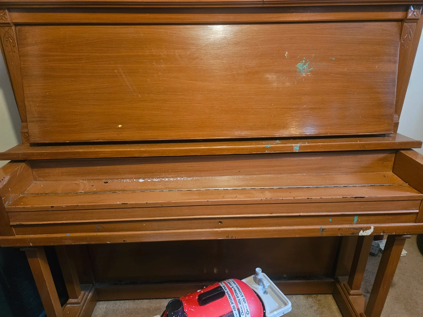 Selling a brown upright piano. It has some wear and tear, as you can see from the photos, but it's still a great instrument for anyone looking to learn or practice! It would look great in a living room or music space