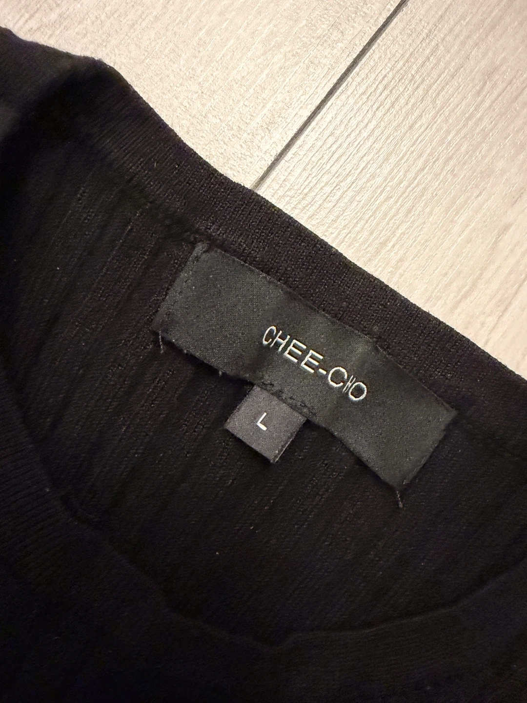 This is a CHE-CHO knit top with a black ribbed bodice and contrasting blue and white striped bottom. It's a size large. The sleeves have button cuffs.