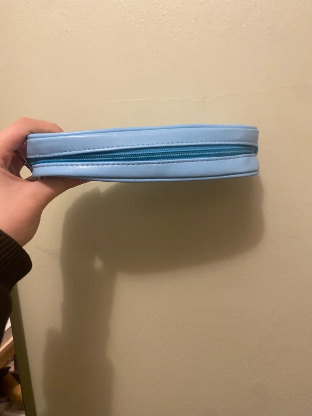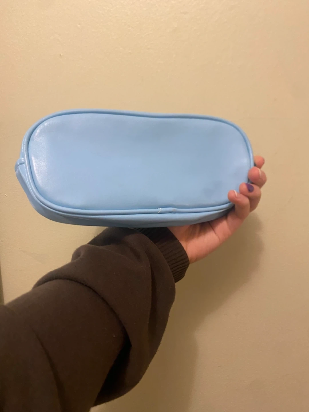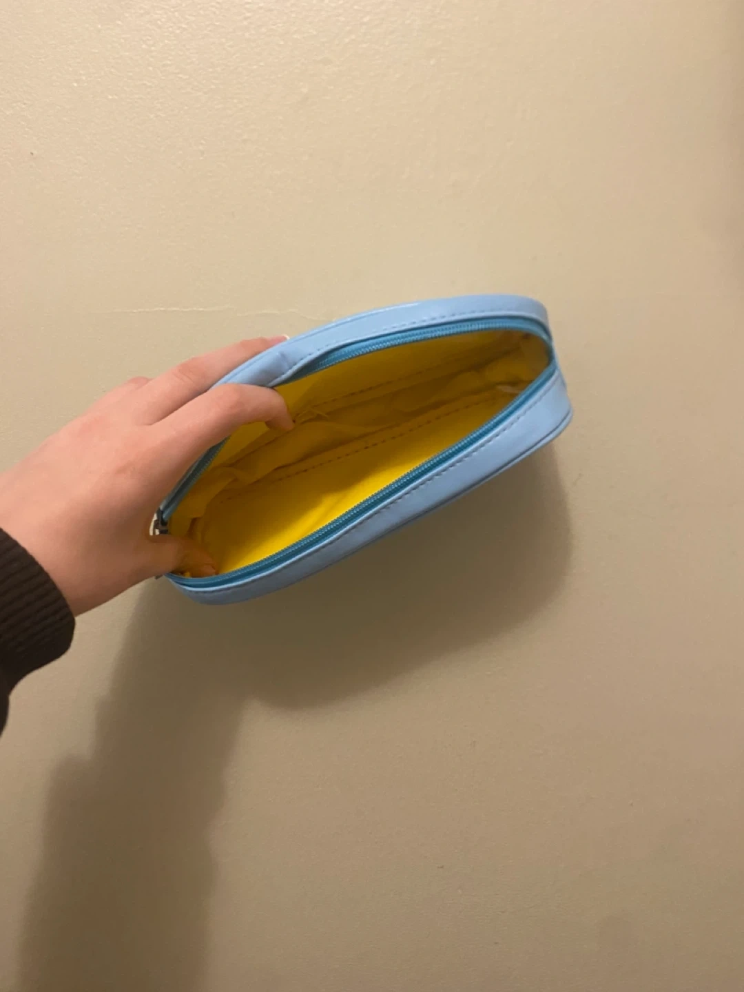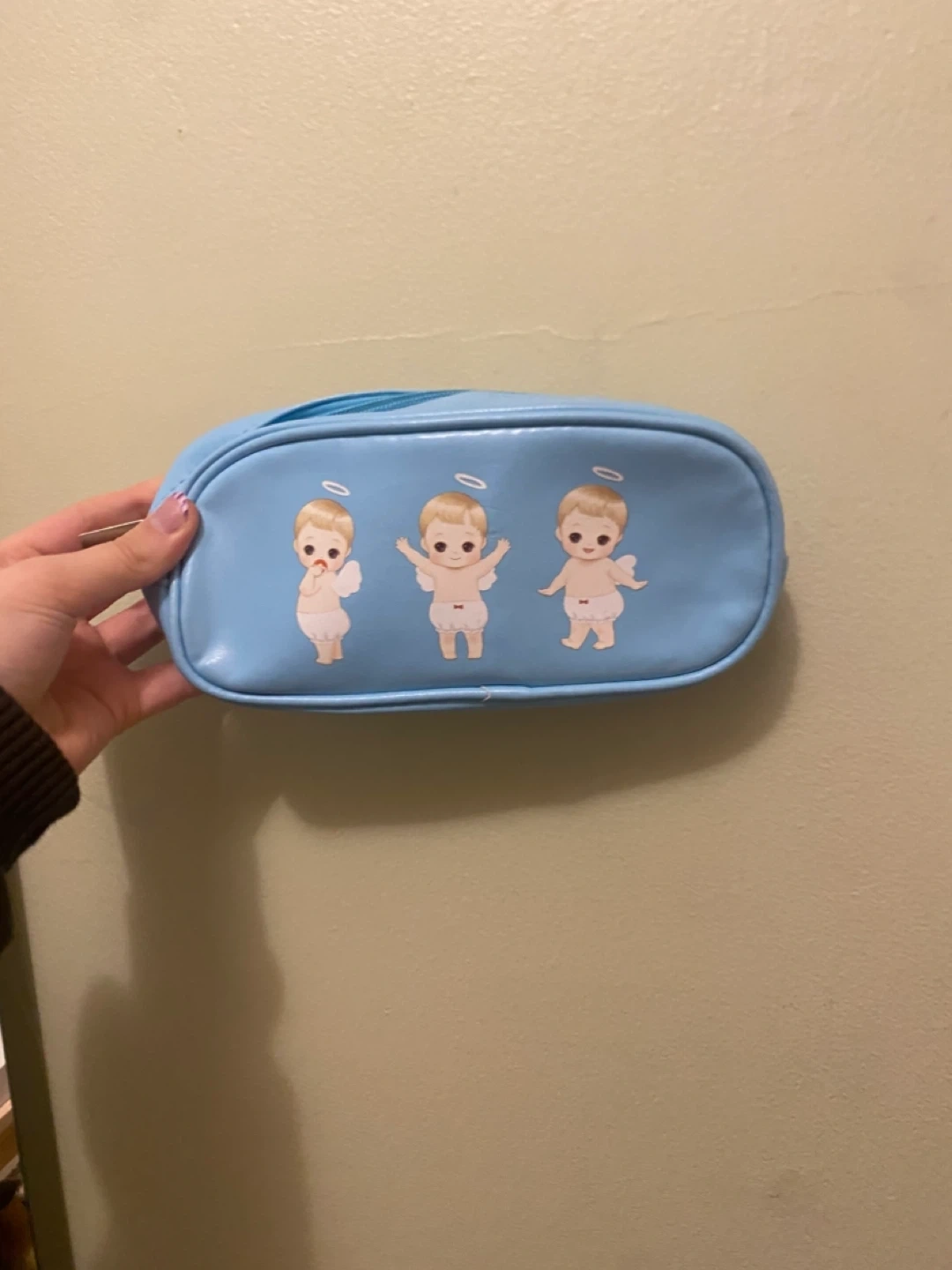 5Cute light blue cosmetic bag with a fun angel design! It's in great condition and perfect for keeping your makeup or toiletries organized. It’s a great size for travel or everyday use. Cash only please :)