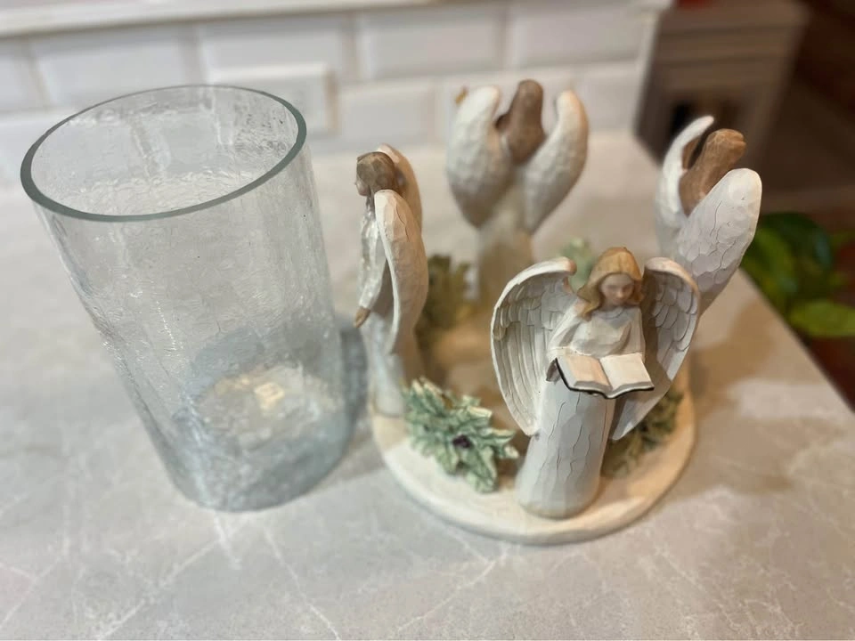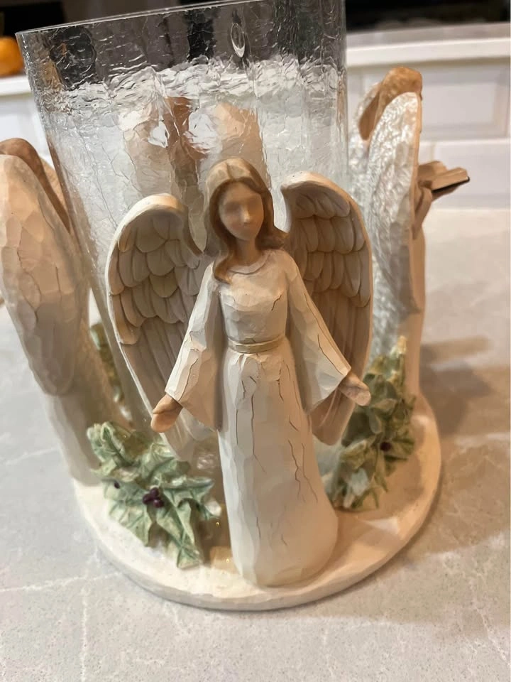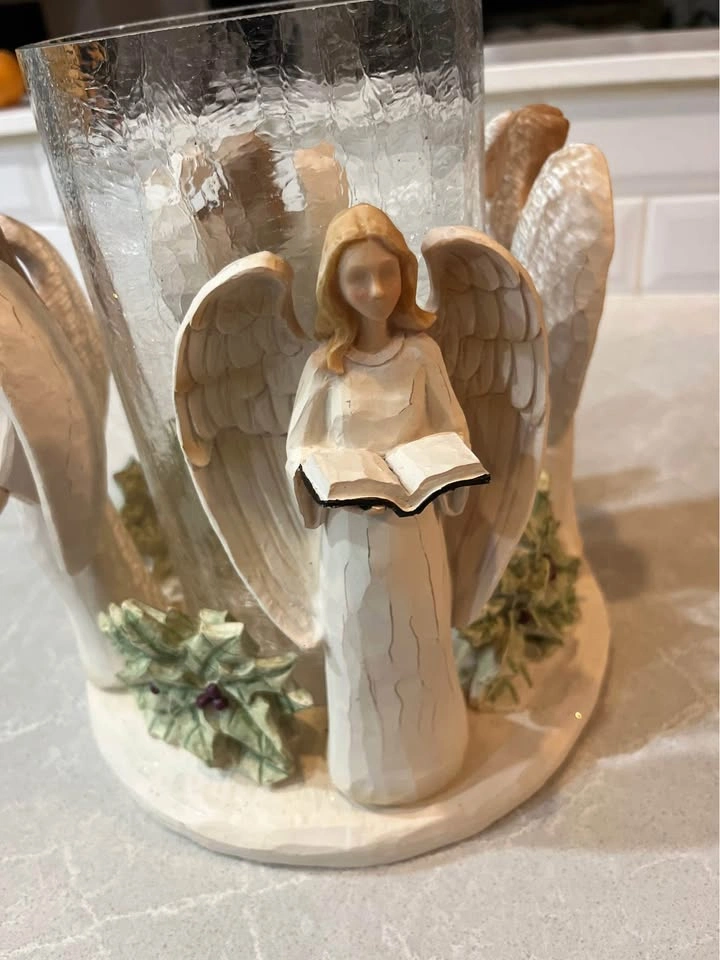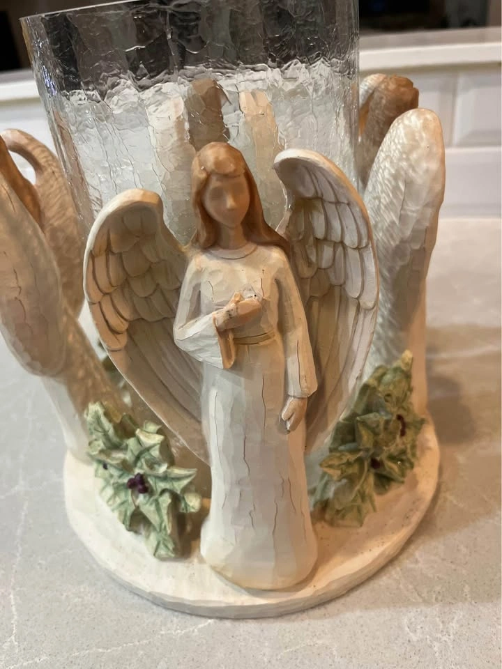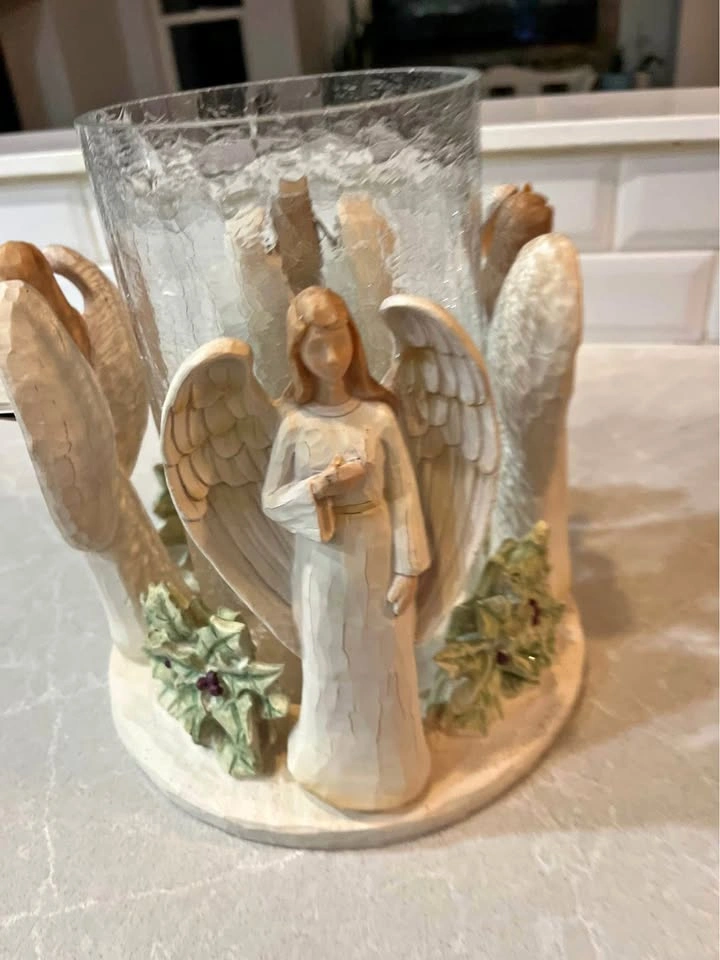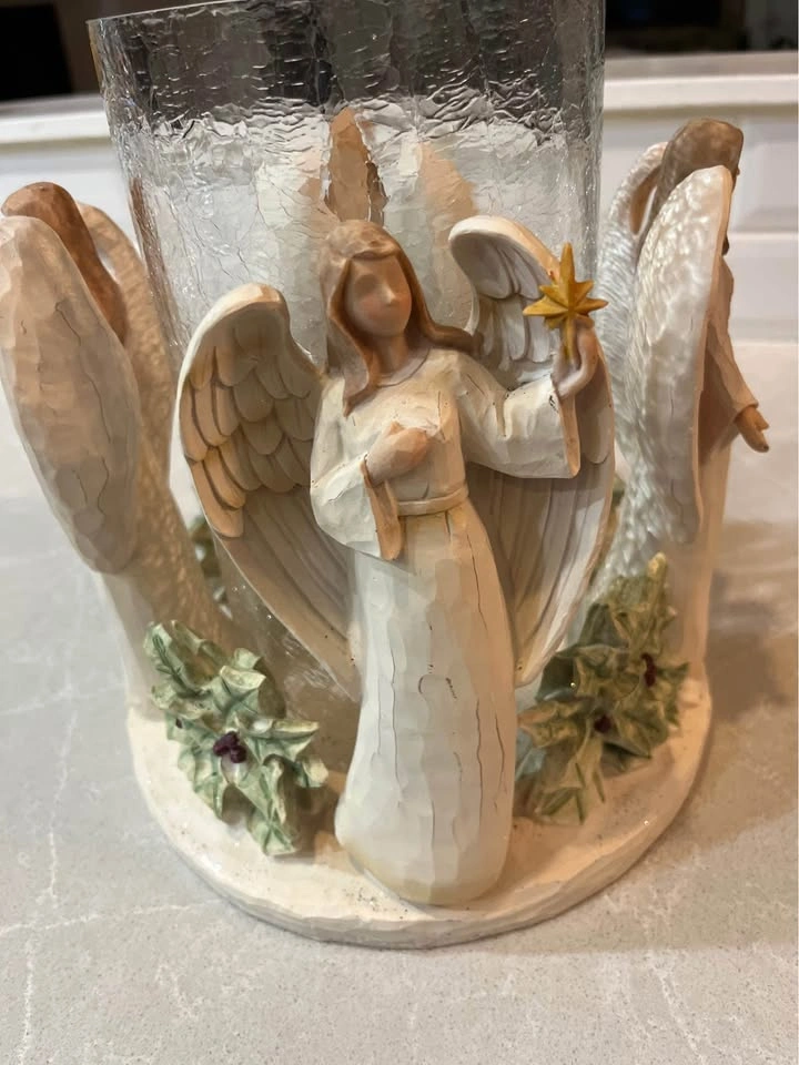 10Angel candle holder. About 9.5” tall, glass is about 4.5”