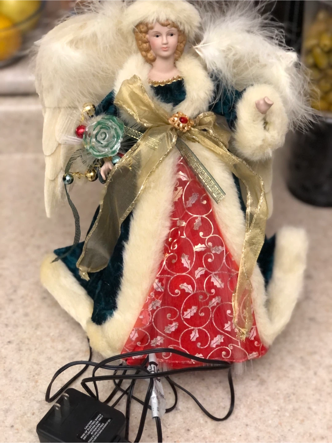 77Angel Christmas tree topper in excellent condition 12” tall It’s new and was never used Features a beautiful red and gold gown, adorned with a lovely gold bow, It also has fluffy white wings and a power cord to light up your Christmas tree this holiday season