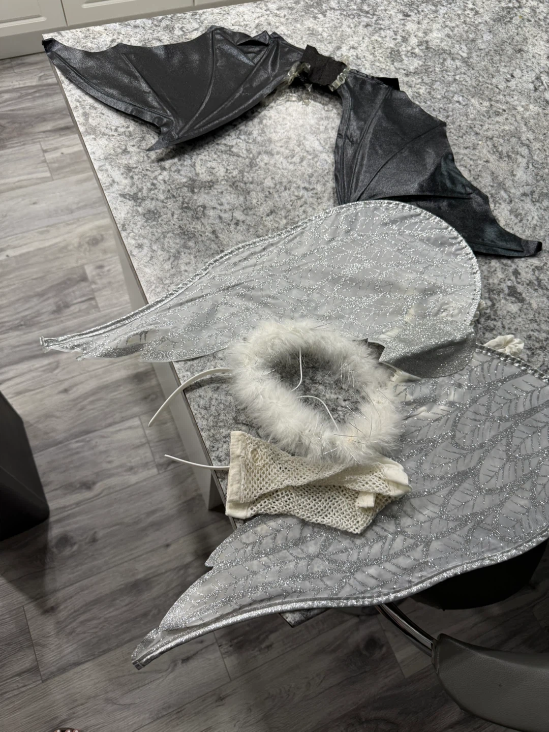 10Selling a costume set that includes both angel and devil wings! The angel wings are a sparkly silver, and the devil wings are black. Also included is a white, fluffy halo and some matching gloves. Perfect for Halloween or dress-up!