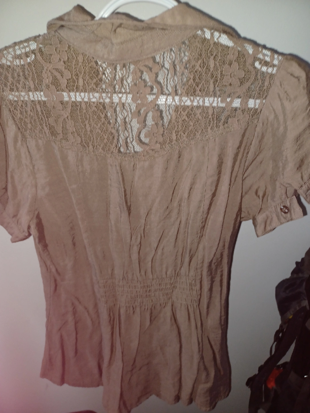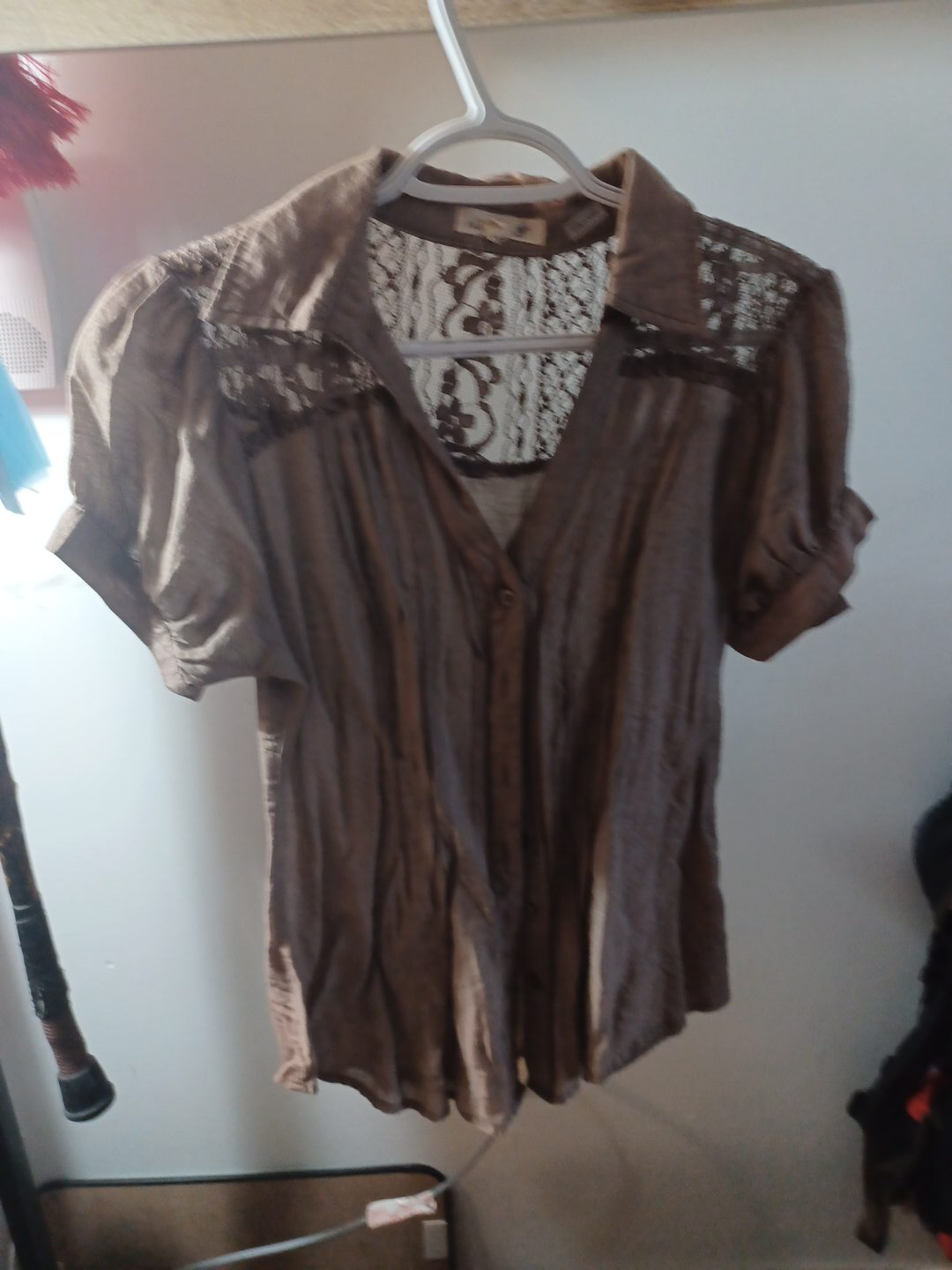 75Here's a cute Angel Kiss blouse with lace accents! It's a brown colour and has short sleeves. Perfect for adding a touch of elegance to your outfit
