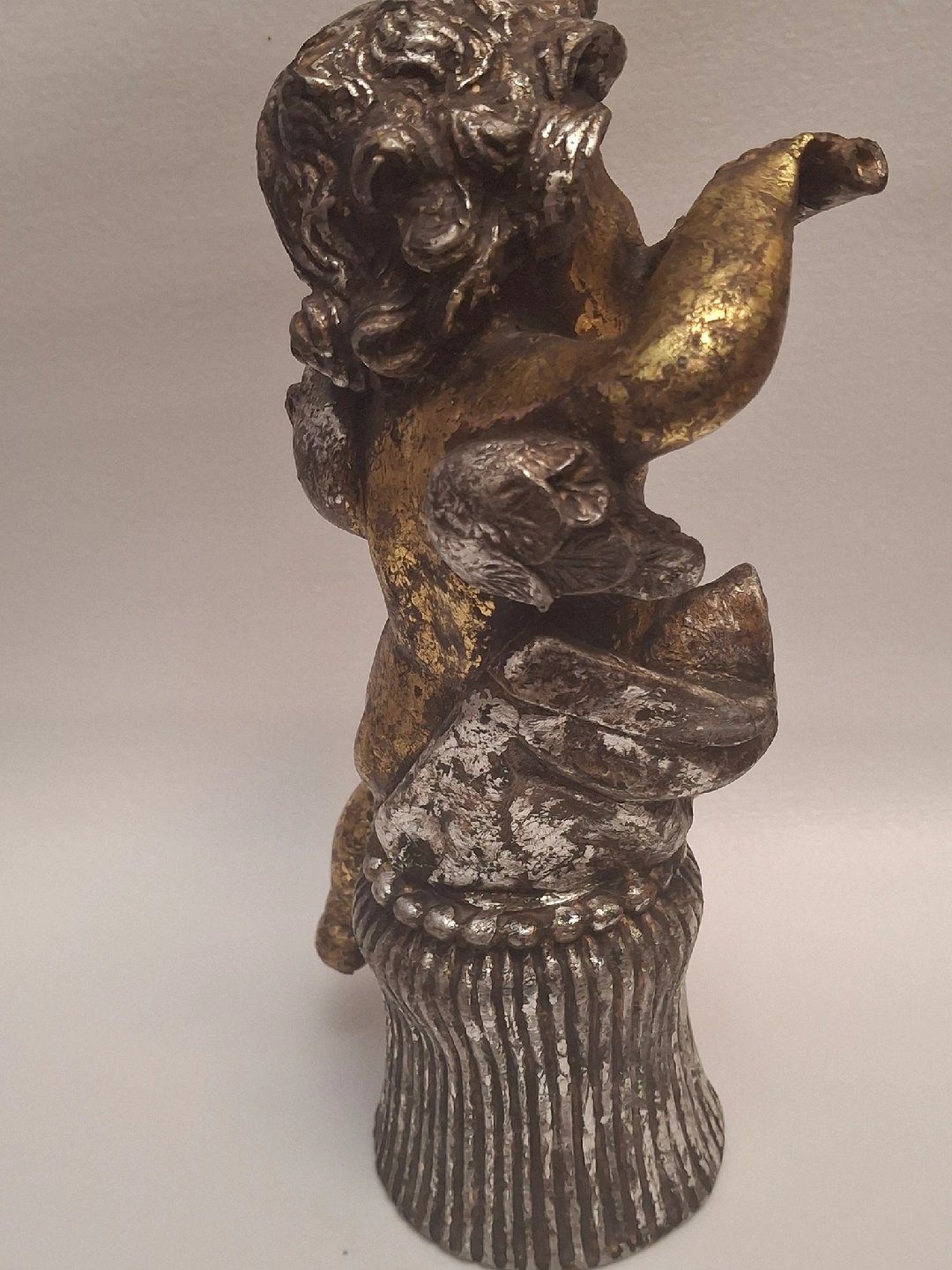 A lovely angel statue playing the trumpet! It's a beautiful piece with a gold and silver finish, wooden Cherub Figurine