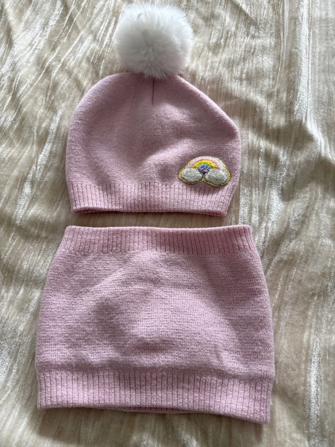 Adorable pink knit hat and neck warmer set. Features a cute rainbow patch and fluffy pompom. Size 6 to 8. Perfect for keeping little ones warm and cozy.
