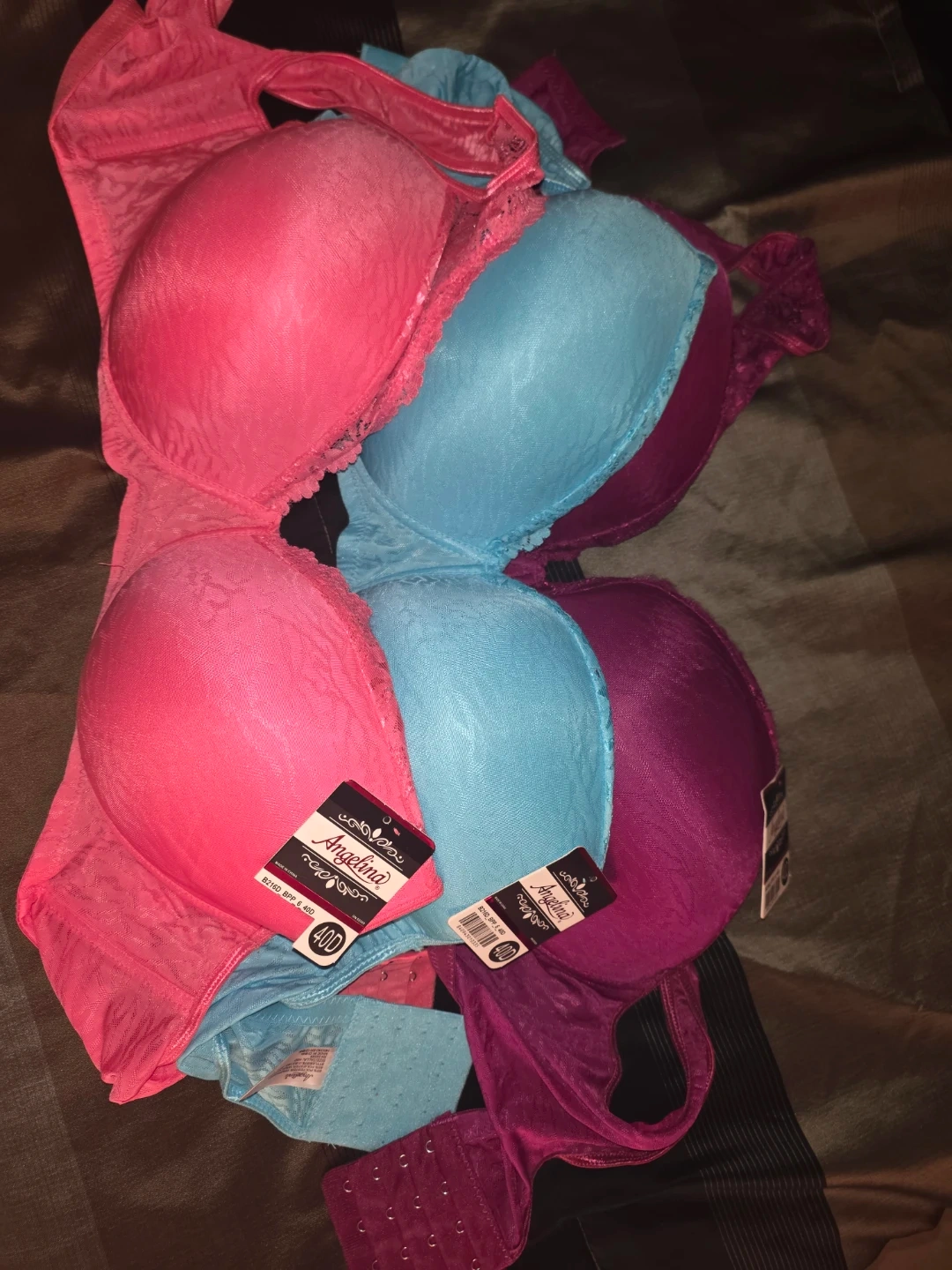 Selling a set of Angelina bras, all in size 40D! There's a mix of colours including pink, blue, and purple. New!