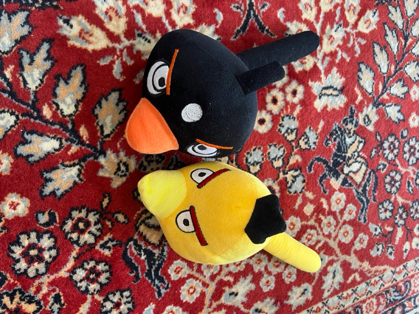 Two Angry Birds plush toys. One black bird, one yellow bird. Soft and cuddly. Great for kids or collectors.