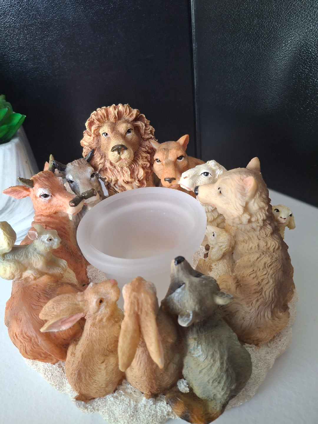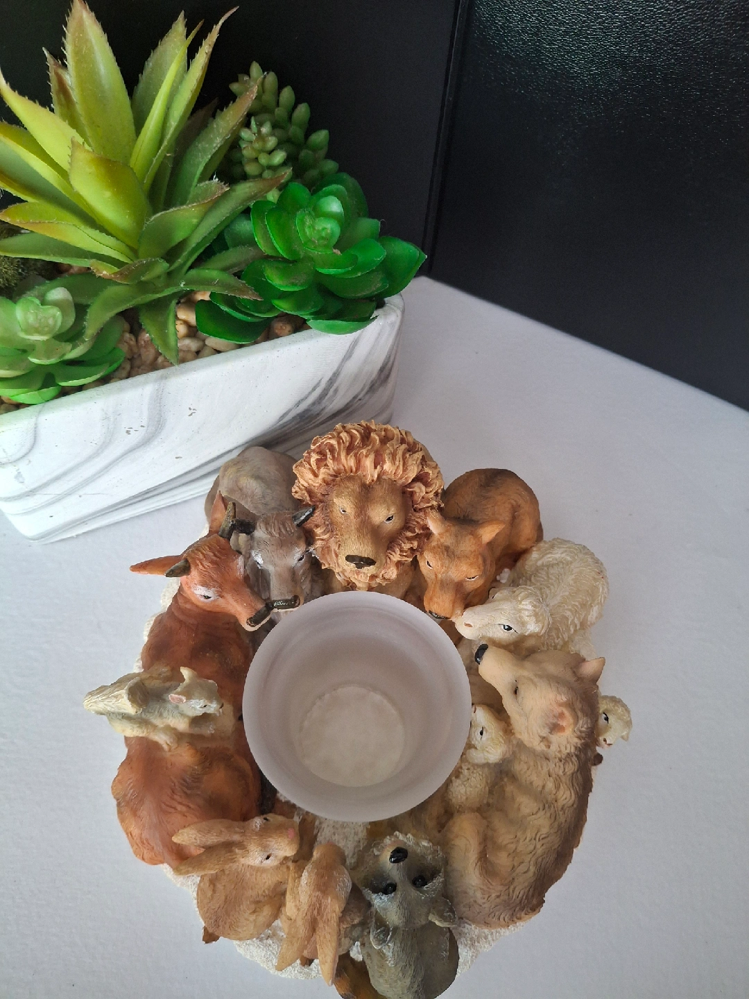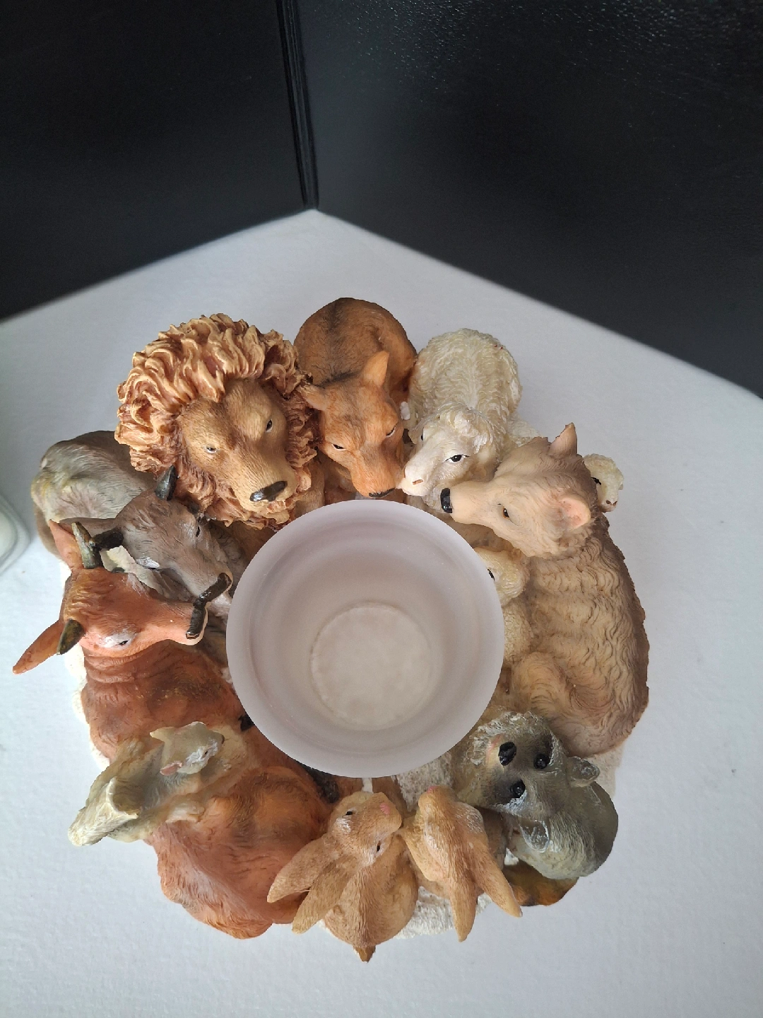 This is a unique candle holder featuring a variety of resin animal figurines encircling a frosted glass candle cup. 20x12cm