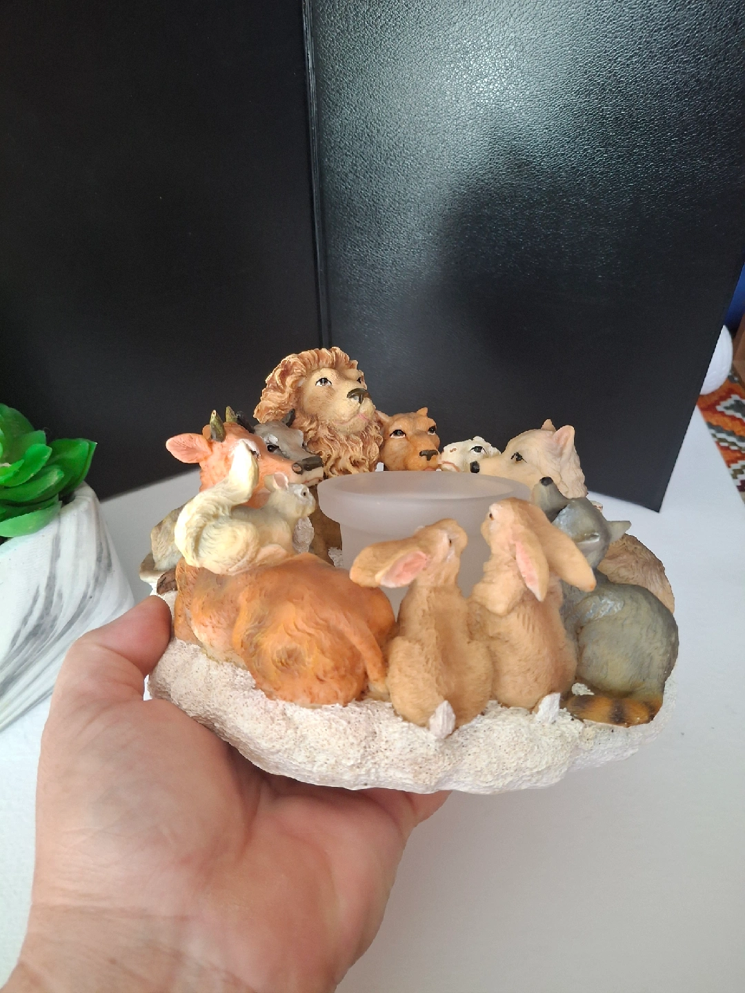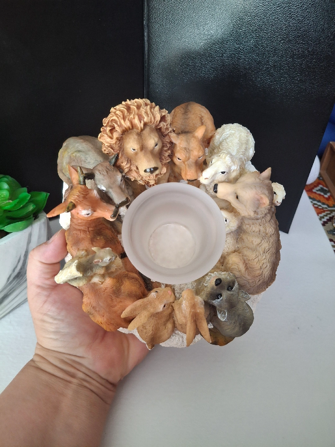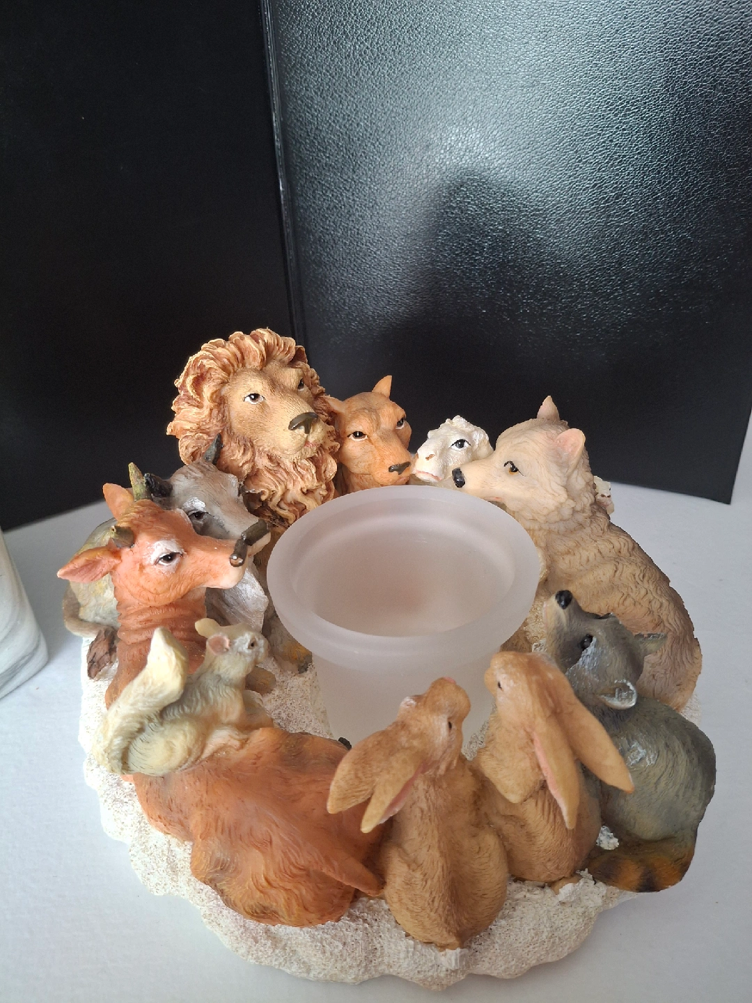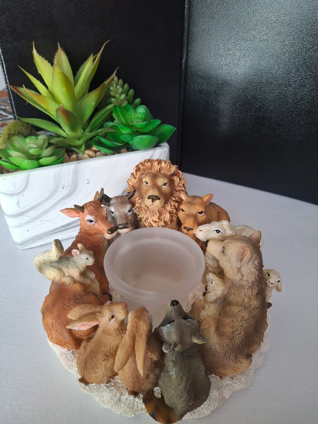 This is a unique candle holder featuring a variety of resin animal figurines encircling a frosted glass candle cup. 20x12cm